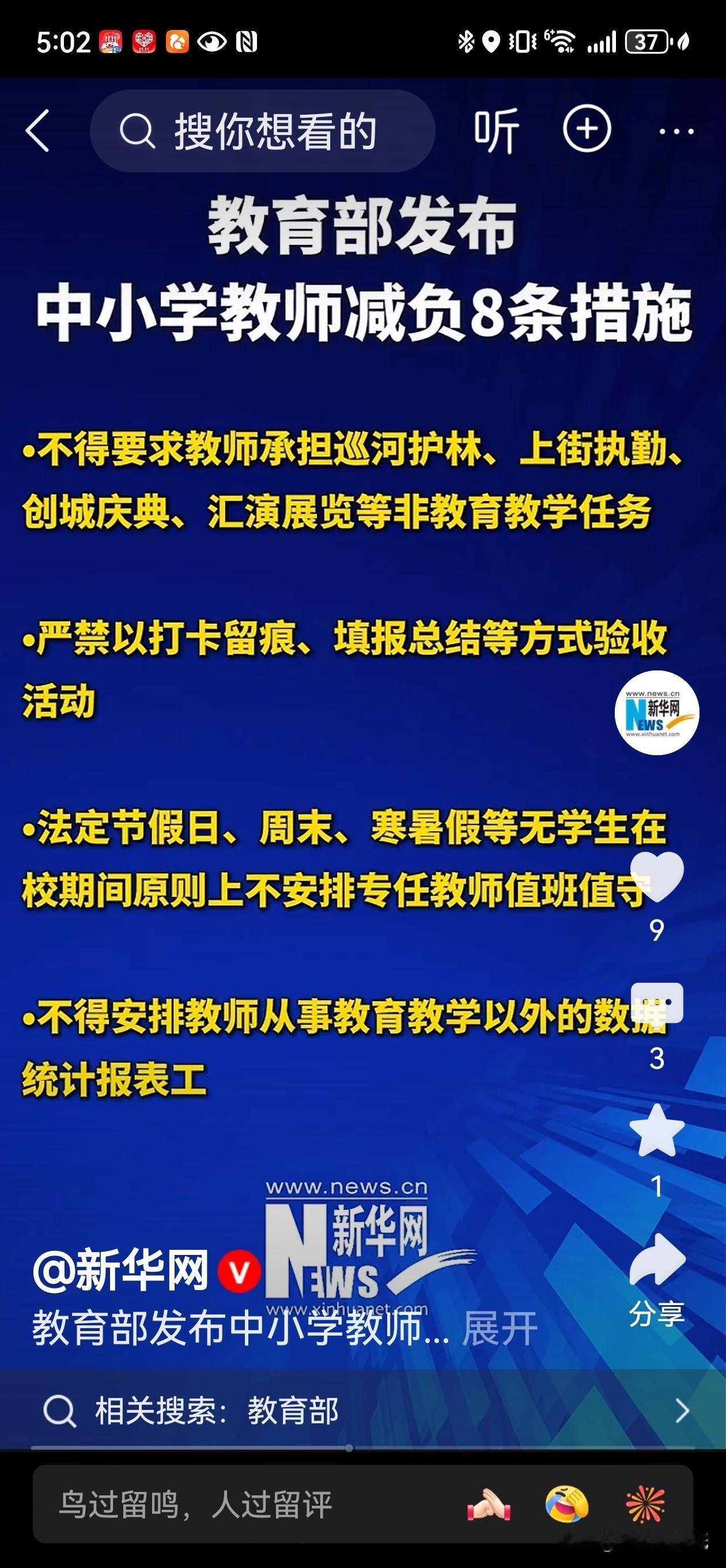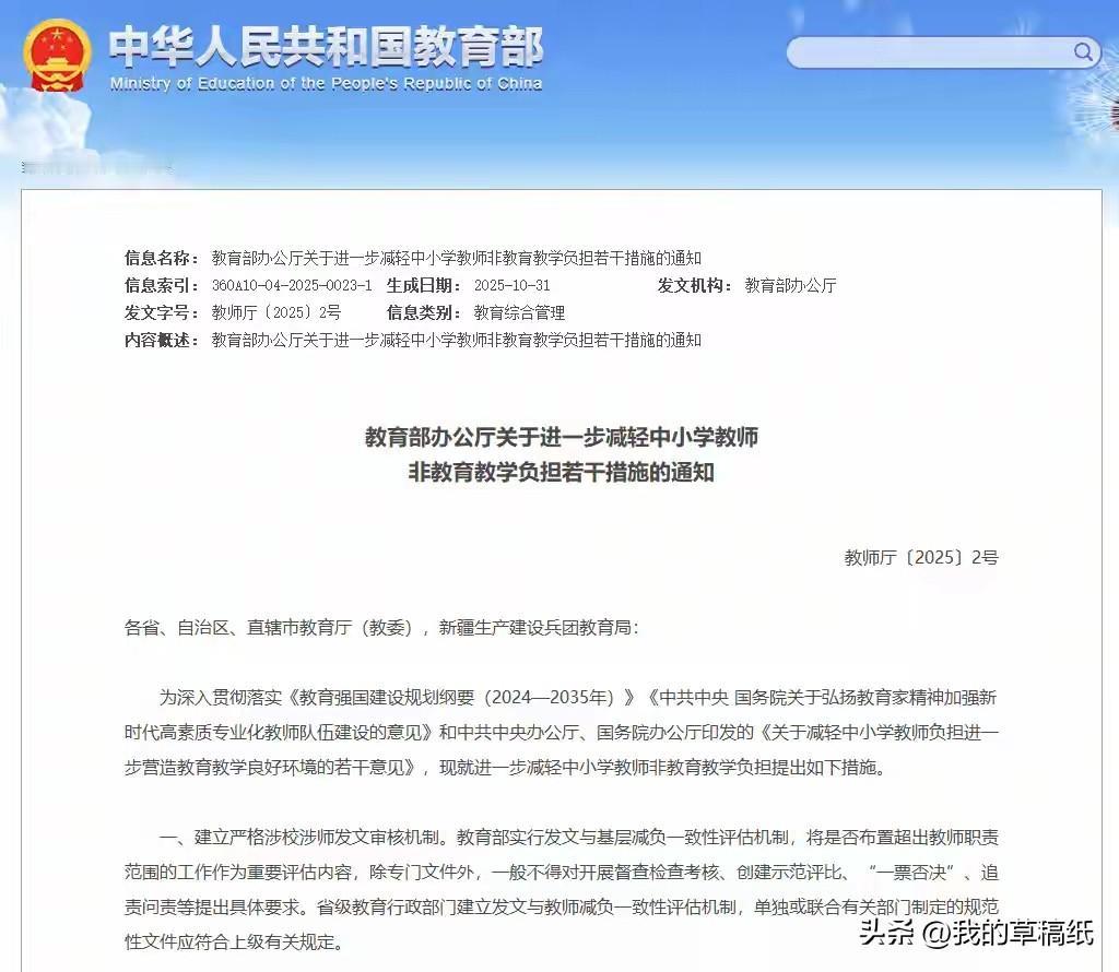 教育部新出的“减负八条”真是说到老师们心坎里了!节假日不值班、严禁摊派巡河护林、上街执勤这些“杂活”,让教师终于能回归教书育人的本分。 这些年,教师被非教学任务压得喘不过气——有的学校一年收到近4000份文件,35%与教学无关;有的老师周末还得顶着烈日去路口执勤,备课时间被挤占得所剩无几。 网友调侃:“教师成了‘全能选手’,就差没去种地了!” 新规直击痛点,难怪一线教师拍手叫好:“终于能安心教书了!” 但叫好之余,更得看落实。过去类似政策不少,可“检查照旧、任务照摊”的现象仍存。这次能否真正堵住形式主义的漏洞?关键得看地方执行——别让“白名单”成了空话,别让减负变成“纸上风景”。 教育是静待花开的事业,教师减负不是“躺平”,而是让教育回归纯粹。政策有了,下一步,咱们得盯着:别让好经念歪了!