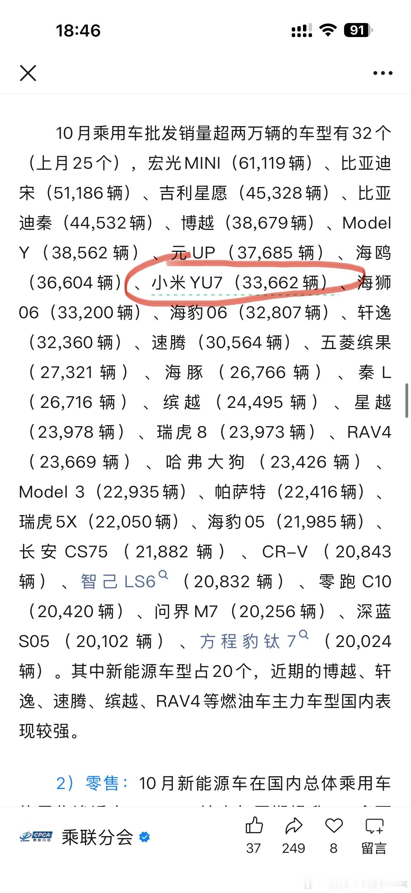 乘联会官方公布 10月新能源车企销量,小米汽车48654辆,小米还是低调了实际交付4.8万,海报只说4万+[笑而不语]其中小米YU7 10月33662辆,实现了对特斯拉Model Y国内销量的超越,第一财经标题可以改成小米YU7仅月销3.3万了。