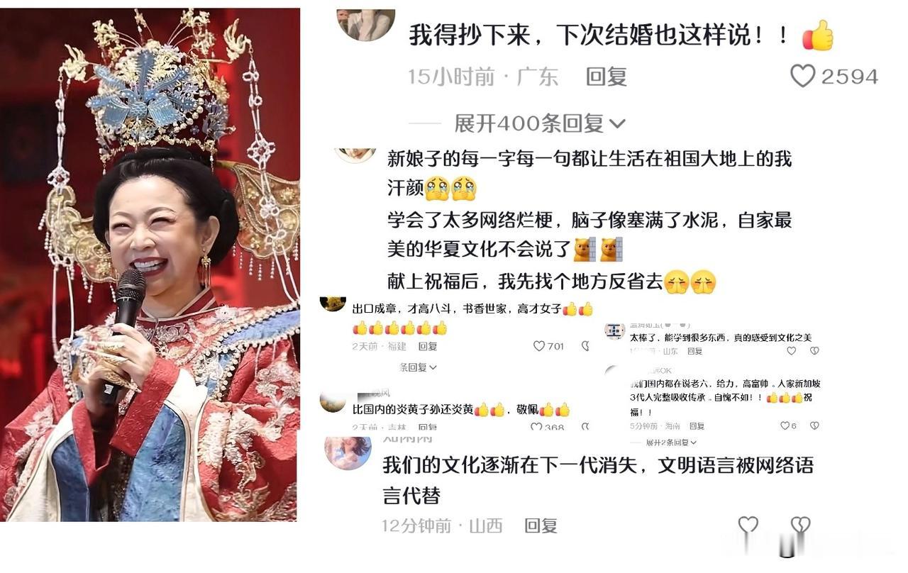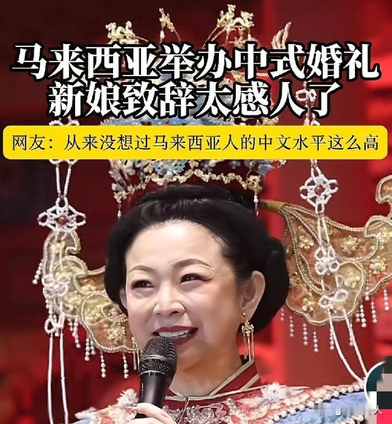 马来西亚,海外华人婚礼,新娘脱稿致辞爆火 网友看了→出口成章,用词太美太感人,纷纷表示要抄下来,到自己结婚时也这样说! ———————————————————— 新娘致辞原文🎤: 各位尊亲、长辈、家人、挚友,晚上好!承蒙诸位厚爱,莅临于此,来见证我们的婚姻之喜。在此要对各位到来的嘉宾表达最真挚的感谢,感谢诸位。 首先要感谢我的先父和我的母亲。父兮生我,母兮鞠我,养我育我,一世恩德,殚精竭虑终为子,无私奉献父母亲。谢谢你们对我的生育之恩,养育之德,成人之美。 接下来要感谢我的先翁先姑,特别要感谢我的先生靖原。姐姐、姐夫和各位亲人,是你们在他的成长中给予了无私的关爱与支持,让他今天能够成为一位胸怀大志,顶天立地,温柔谦逊的人。如今我们成为家人,切切之恩似高山之宏,绵绵之情若江海之水。谢谢你们。 我的先生靖原,在此荷开并蒂之时,我心中有诸多言语想同你说。我愿与你同甘共苦,同舟共济。在风起时笑看落花,在雪舞时共品茗茶,松萝共依共人生。丹心不渝不负卿,未来一生白头与共。 今天良辰,美景赏心,悦事之四美具。嘉宾,贤主之二难并。 我衷心祝福在座嘉宾春生夏明朗,秋祈冬瑞康,鸿福长安泰,万事皆胜意。 恭谨拜谢。 ———————————————————— 😭有网友感动点赞: →我得抄下来,下次结婚也这样说!!👍 →新娘这文采不得不服,感觉这才是中国人的样子! → 这位新娘的中文修养值得我们尊重!我们一般的在大陆生活的人都达不到,他们在马来西亚的华人能够坚守中华文化化传𠄘就是炎黄子孙!!👍👍👍 …… 🤔也有很多网友反思: →我们国内都在说老六,给力,高富帅。人家新加坡3代人完整吸收传承。自愧不如!! →我们的文化逐渐在下一代消失,文明语言被网络语言代替! →好词,一个外国华人,把中国文字说的头头有道,应该是学识渊博👍👍 …… 中华文化博大精深,中华文化源远流长,优美、深远的中华上下五千年,海内外的中华儿女、华夏子孙,都应时刻不忘传承、弘扬、光大我华夏文化!