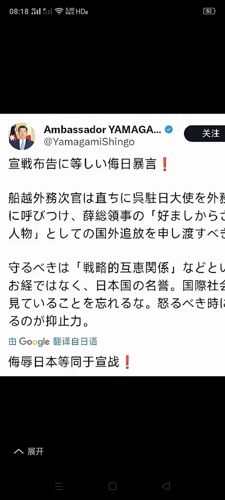 日本驻澳大利亚大使说,侮辱日本等同于宣战。这像一国大使说的话吗?怎么感觉自高市早苗上台后,日本驻外大使都变的嚣张了呢? 首先说什么叫侮辱日本?说什么样的话叫侮辱日本?要是说当年的侵华日军猪狗不如,这算不算侮辱日本呢?我怎么觉得这个比喻是在侮辱猪和狗狗呢?猪是中国人民最重要的动物蛋白来源,狗是我们人类最忠实的朋友,能给我们提供情绪价值,而侵华日军的呢?除了烧杀抢掠之外,干过什么好事? 其次,别动不动就拿宣战威胁,日本是有个好“干爹”,但这个“干爹”靠不靠得住还不一定吧?泽连斯基被迫签约《乌美矿产协议》,那日本现在还有什么可以“卖”给美国的呢? 和睦相处不好吗?互利共赢不香吗?别动不动就喊什么“台湾有事就是日本有事”,或者是什么“集体自卫权”,更别拿什么宣战吓唬人,我们不吃这一套!