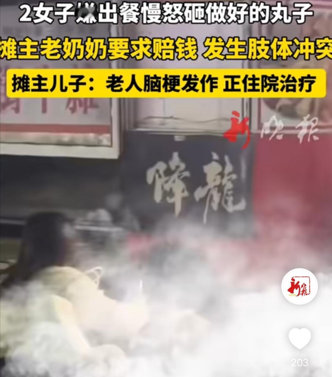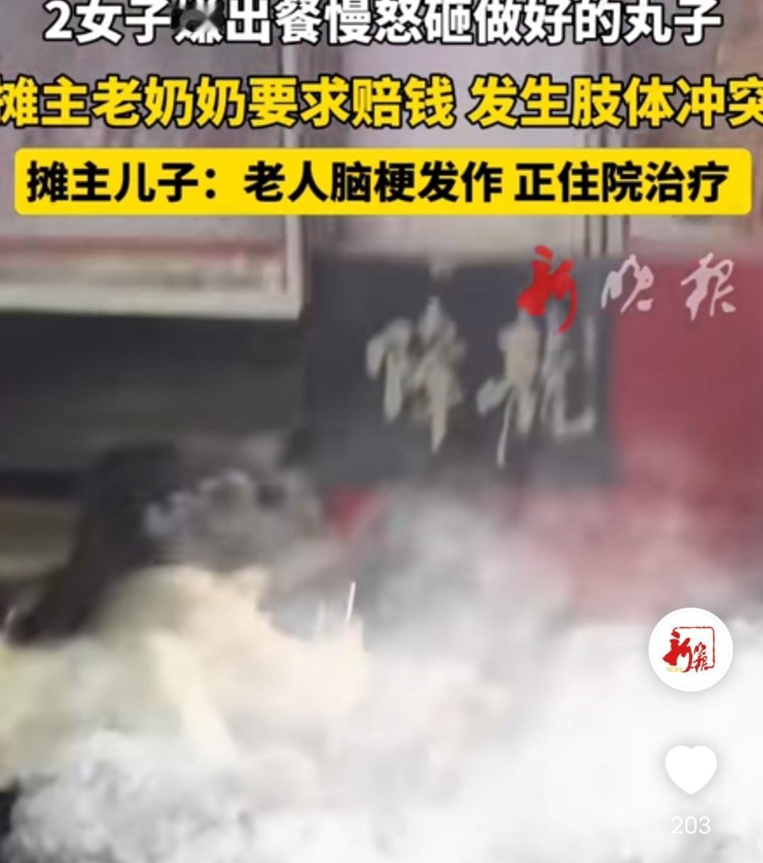 两名女子嫌出餐慢怒砸做好的丸子,与摊主奶奶发生拉扯,摊主儿子说老人脑梗发作,正住院。 看到相关媒体平台的报道,这个事件是发生在湖南,两个年轻女子买丸子,摊主是个奶奶,她们嫌老人出餐慢了,就怒砸做好的丸子,还与老年人发生拉扯,最后摊主的儿子透露说老人脑梗正住院。 真的想不明白,现在的年轻人怎么回事,老年人,做事本来就没有年轻人快了,明知道就要做好有耐心等待的准备,还有,哪里学到的这些痞子气?觉得让自己不满的,发个脾气别人就害怕你?就显得自己很威风?那么有没有通过别人的视角看看自己那样子很丑陋,很没有教养?丢的是自己的人啊!