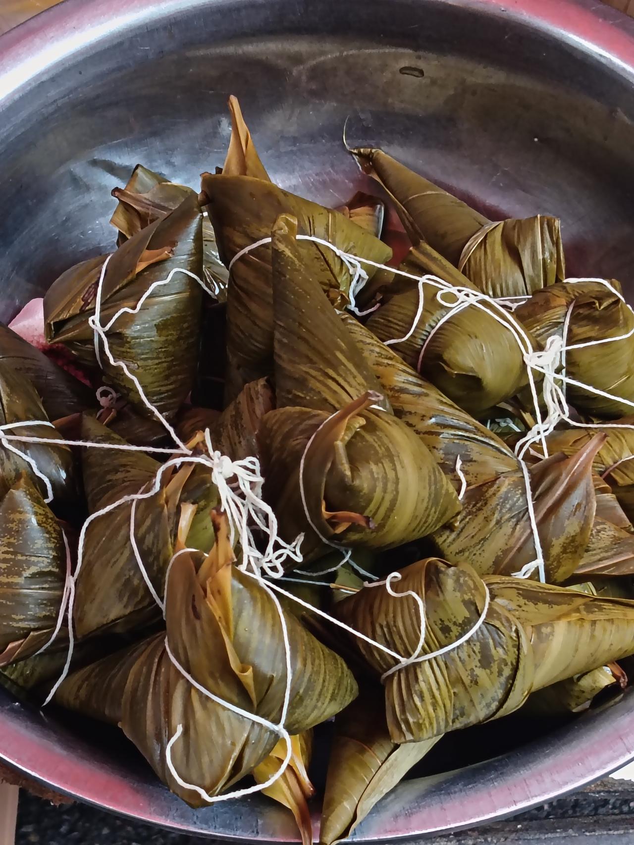 下午蹲厨房包这玩意儿,糯米沾得满手黏,往粽叶里塞豆沙时偷偷多摁一勺,我妈在旁边敲我手背:“甜齁着!”我嬉皮笑脸把粽叶折得更紧,缠棉线时手勒红了也不肯松,她又递来湿毛巾:“慢点儿,没人跟你抢。”看着小尖角支棱起来,俩人都笑了。 等煮好揭锅,蒸汽扑得眯眼睛,先抓个热乎的攥手里。咬一口米粘牙,豆沙甜裹舌头,我妈递来碗糖汁:“就知道你嫌不够甜。”捧着热粽子,连屋里的味儿都暖得让人想叹气。