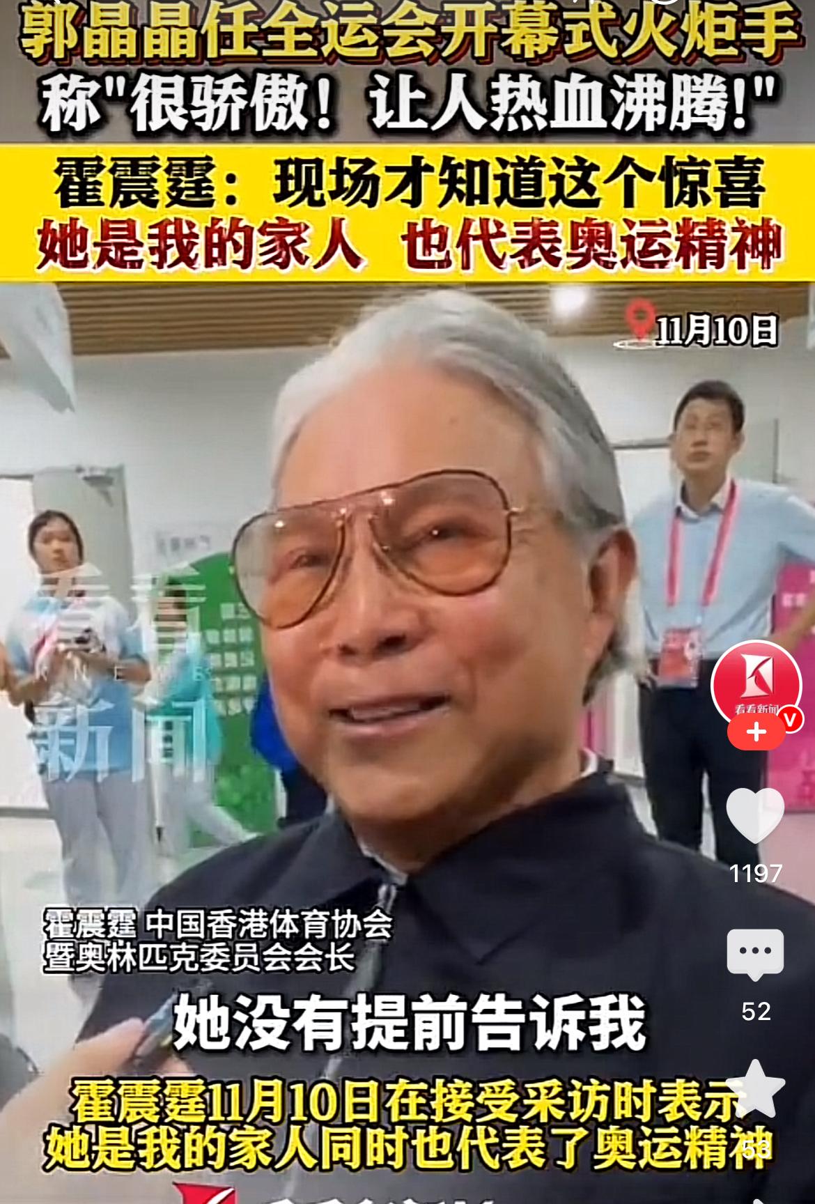 发现了吗, 霍震霆再说到郭晶晶的时候, 那控制不住的上扬的嘴角,看得出来他是真的打心眼里骄傲和自豪! 霍震霆说自己也不知道她是火炬手,到了现场才知道的,也算是给自己一个惊喜了! 看到她能当火炬手特别欣慰自豪,这是发扬体育精神的最好表现! 霍震霆满眼的骄傲的说,她是我的家人,也是代表奥运精神,希望大家多多的支持体育。 霍老爷子真的特别的喜欢这个儿媳妇,郭晶晶是体育健将,所以霍家上下都对体育赛事和各种体育相关的事情特别上心! 霍老爷子那满眼的骄傲真的藏不住了。