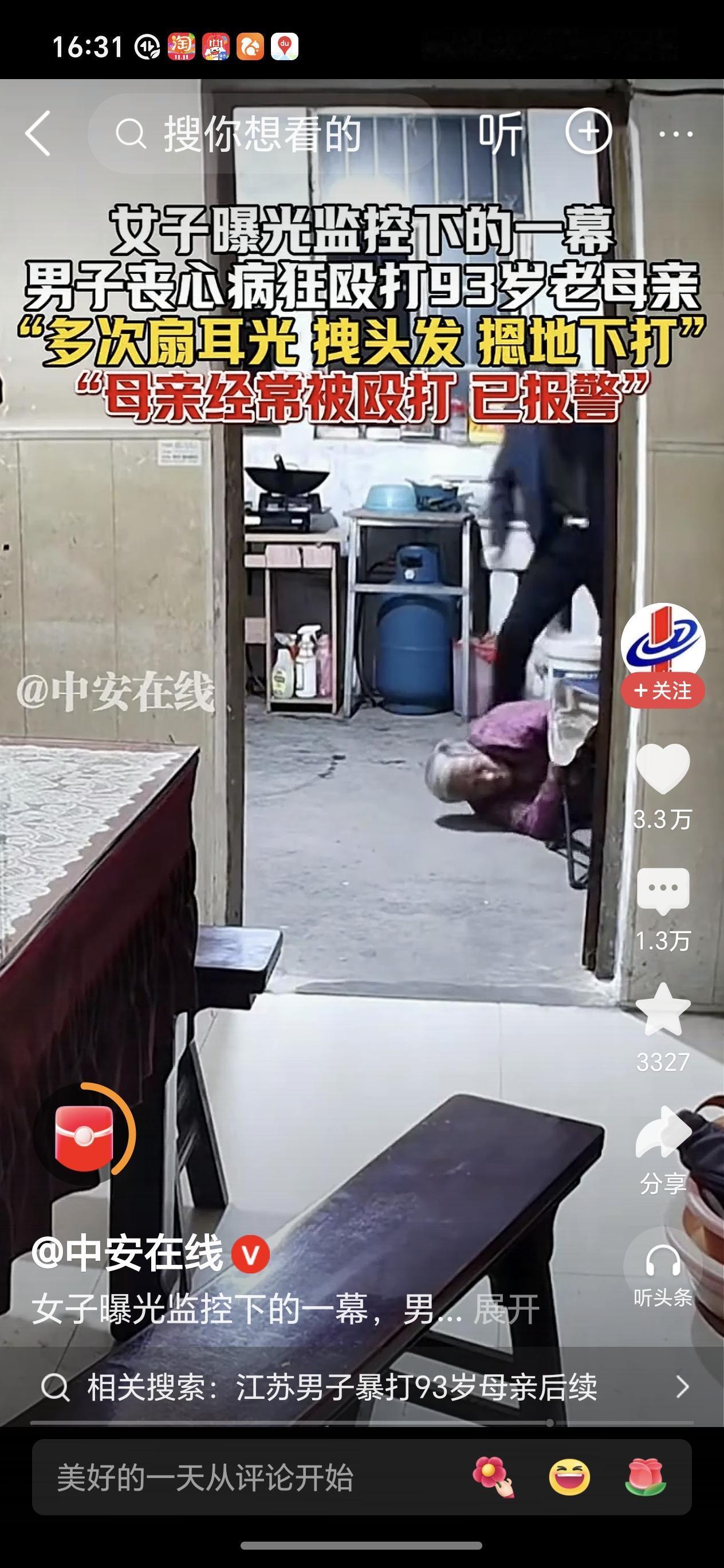 近日江苏常州这起男子殴打93岁老母亲的事件,真的让人怒发冲冠!监控画面里,男子狂扇母亲嘴巴、拽头发,还把母亲摁在地上打,母亲苦苦哀求都没用,实在是丧心病狂。这可是生他养他的母亲啊,这样的行为完全击穿道德和法律底线。 目前,打人的男子已被抓获,具体案情在侦办。家暴从来不是家事,这种暴行必须零容忍。全社会都该形成合力,健全反家暴干预网络,让法律严惩施暴者,不能让尊老养老变成“伤老”。希望这样的恶劣事件不再发生!