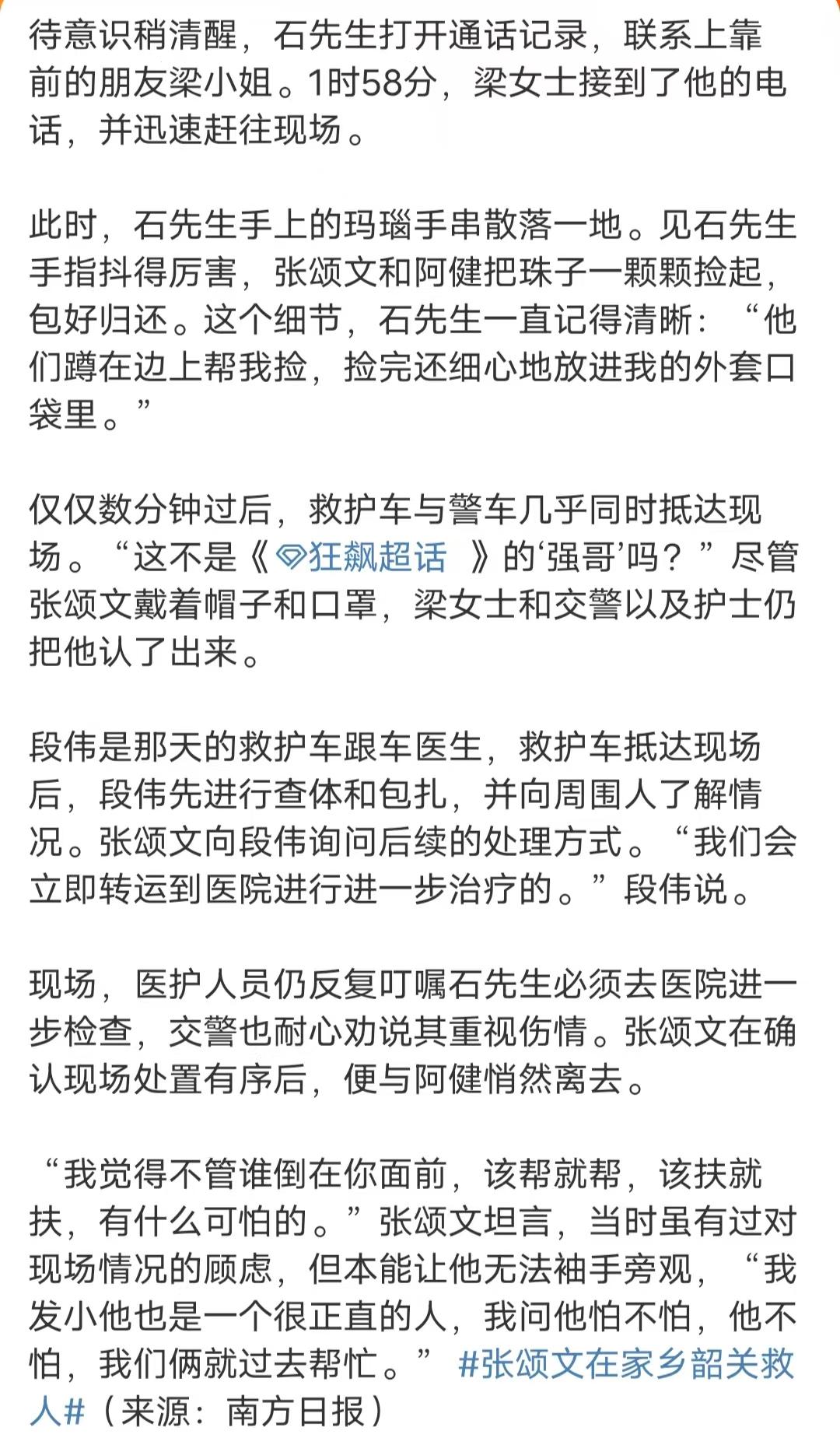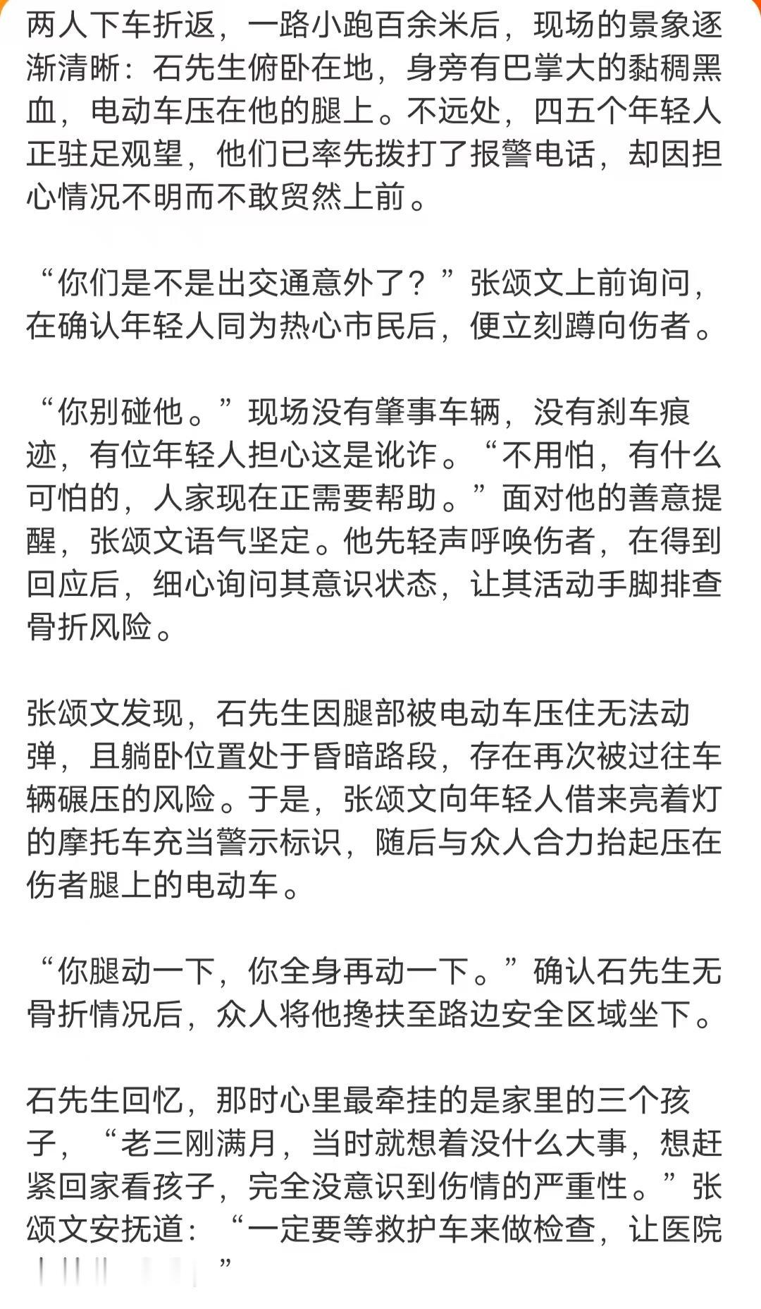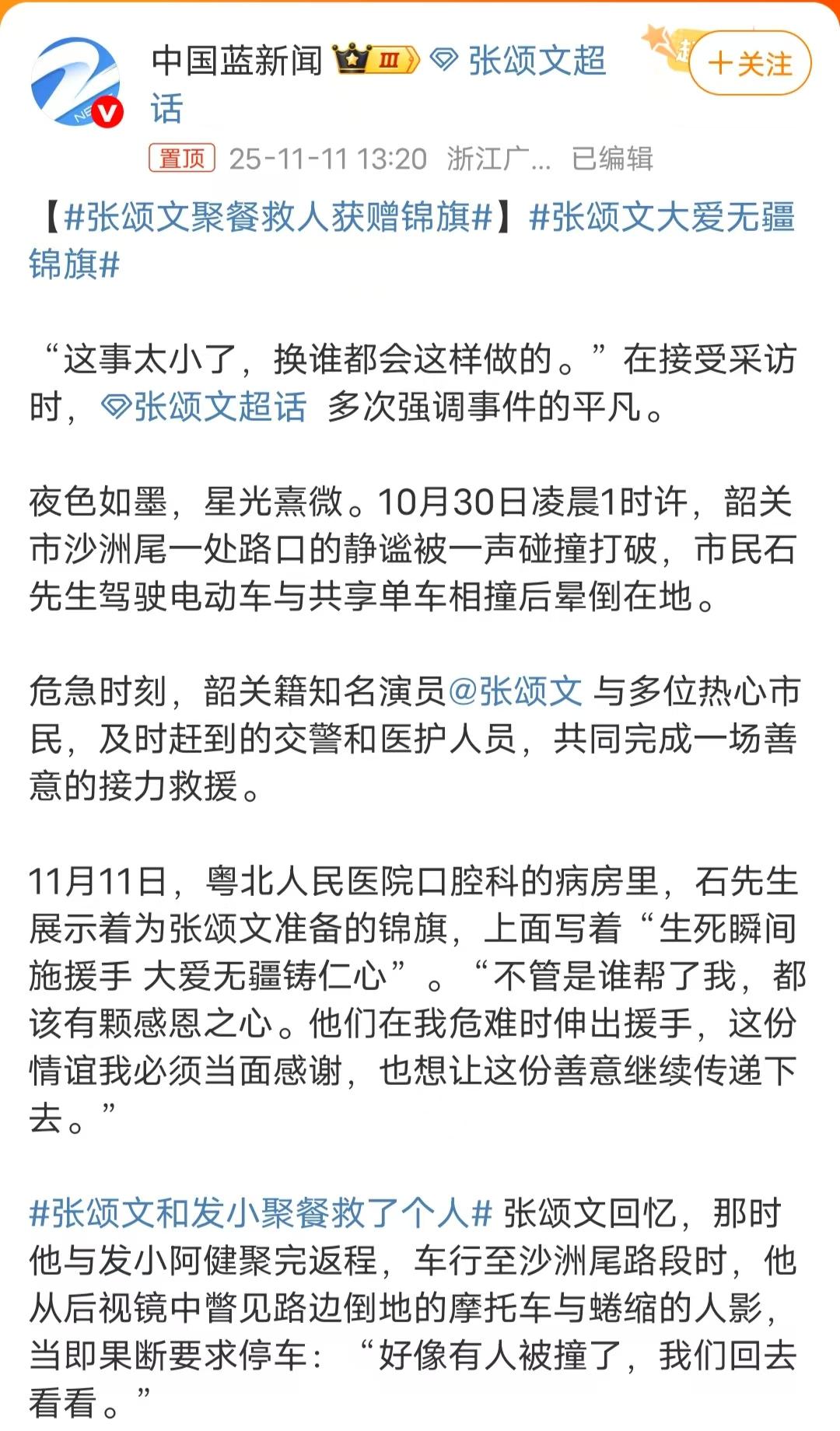 张颂文深夜救人这件事,真的对他刮目相看,换作是大部分明星,要么袖手旁观,要么得好好炒作一番。张颂文救完人后就默默离开了,要不是患者一定送锦旗,这件事可能就这样过去了。 张颂文说这只是一件小事,换作谁都会这么做,该帮就帮。但当时车祸现场就有好几位年轻人,他们只是拿着手机拍照,并无一人在第一时间伸出援手,还是张颂文张罗大家一起来帮忙的。 小事见真章,张颂文大爱无疆,难怪这么多粉丝喜欢他,他值得!演员 张颂文