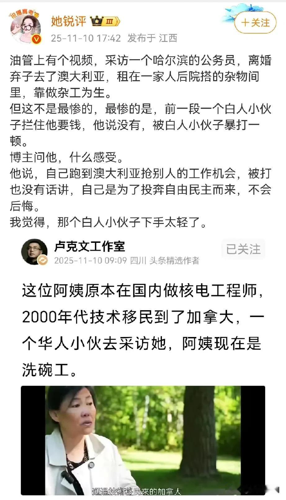 国内是核工程师,跑加拿大当洗碗工,真的不知道这群高知是怎么想的,其实这也是好事,还有在国内是医院副院长,跑国外医院做护工,在国内是公务员,跑国外做杂工的,只有它们走了,把位置空出来给其他人,这些要么就是在国内犯事了,不得不走,要么就是觉得自己的才能在国内没有得到发挥,觉得自己不止是个核工程师,不止是个副院长,不止是个公务员,是国内限制了它们的发展,所以就去国外,才发现自己离开了国内的平台,自己啥也不是,这就跟某些大公司大平台的高管,以为自己多牛,没有自己的能力做贡献,这个大公司大平台就得黄了,然后要求更高的职位和收入,结果公司不同意,它们就跳槽了,结果一跳槽才发现自己是个草包,离开上个公司和平台,自己啥也不是!