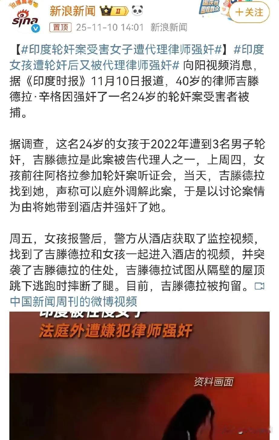 印度的强奸案的剧情,连中国的短剧的编剧都想象力都想象不出来,印度24岁女子被3人轮奸后,然后该女子又被此案的代理律师给强奸,代理律师骗这个女子说可以庭外调解此案,然后骗到酒店,被律师强奸了! 你就说那个中国的编剧敢这样编剧情,估计编出来,肯定会被网友臭骂,但是在印度就真实发生了,印度到底是一个什么神奇的地方,各种离奇的强奸案,就这样的国家,还有一群印吹在吹捧,真的服了!