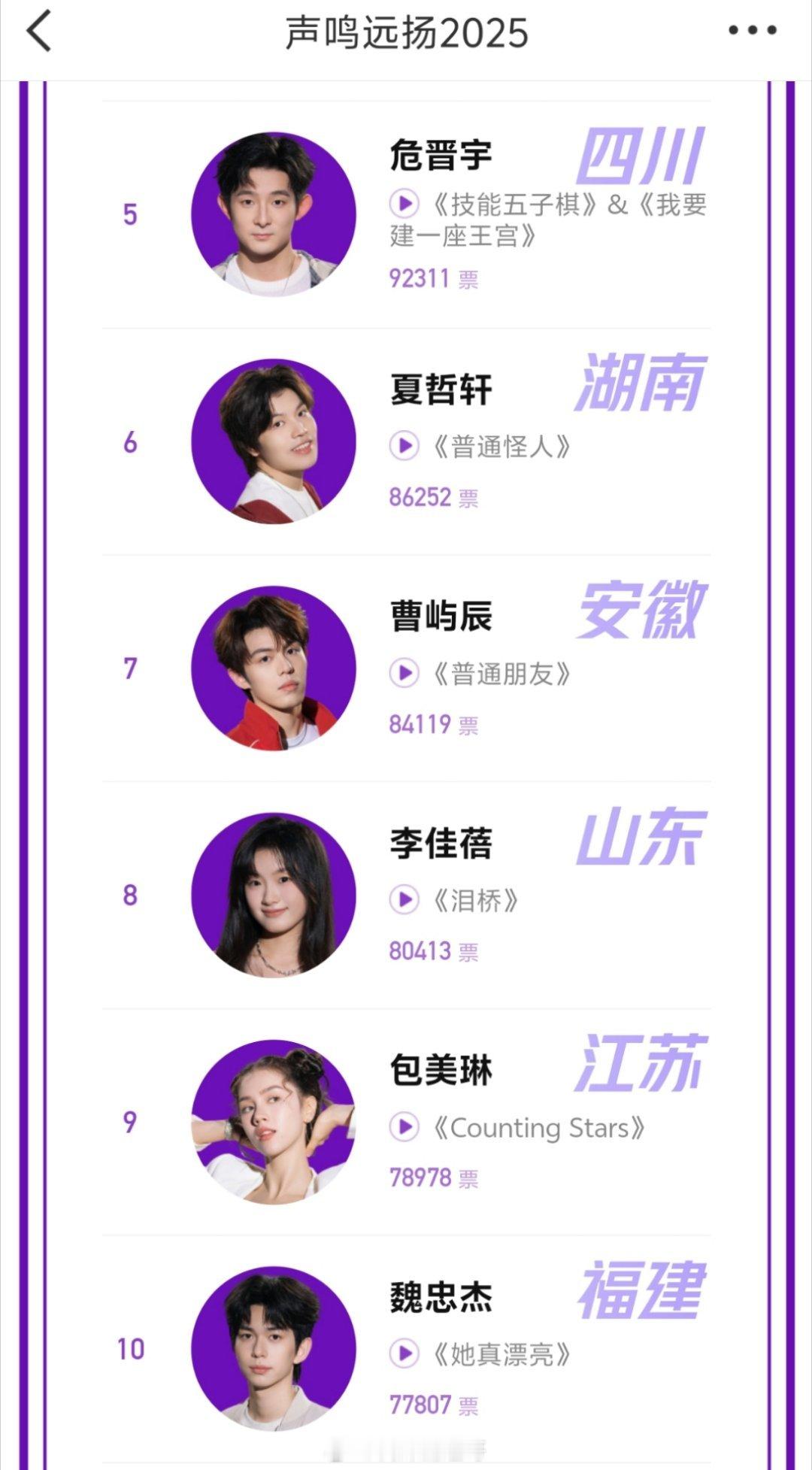 声鸣远扬排名第一名:苗梦初第二名:张璐涵第三名:陈佩贤第四名:高旭第五名:危晋宇第六名:夏哲轩第七名:曹屿辰第八名:李佳蓓第九名:包美琳第十名:魏忠杰四个晋级,三个待定,三个未表演