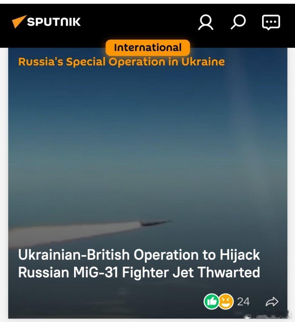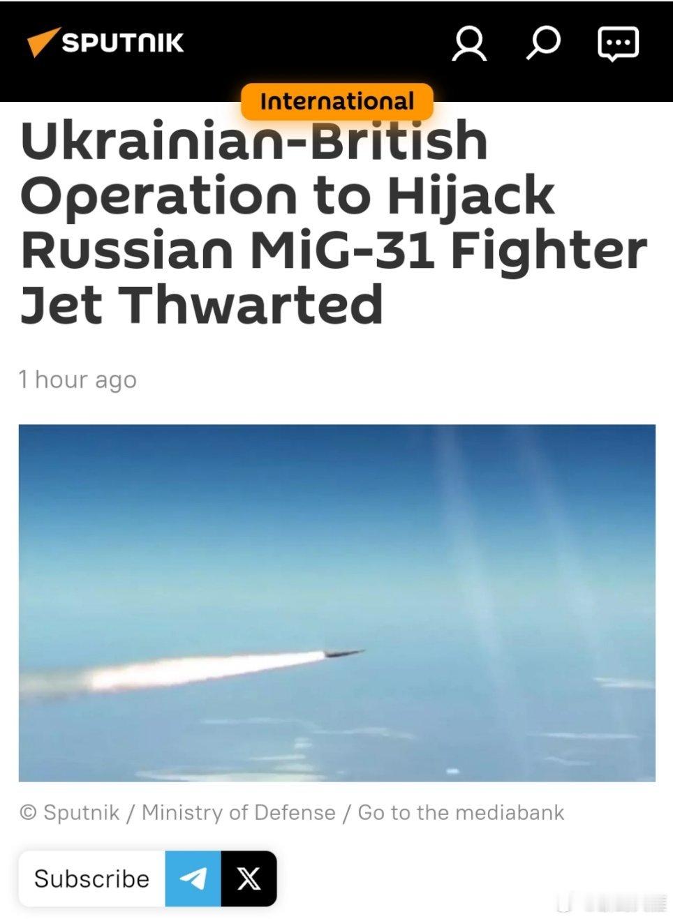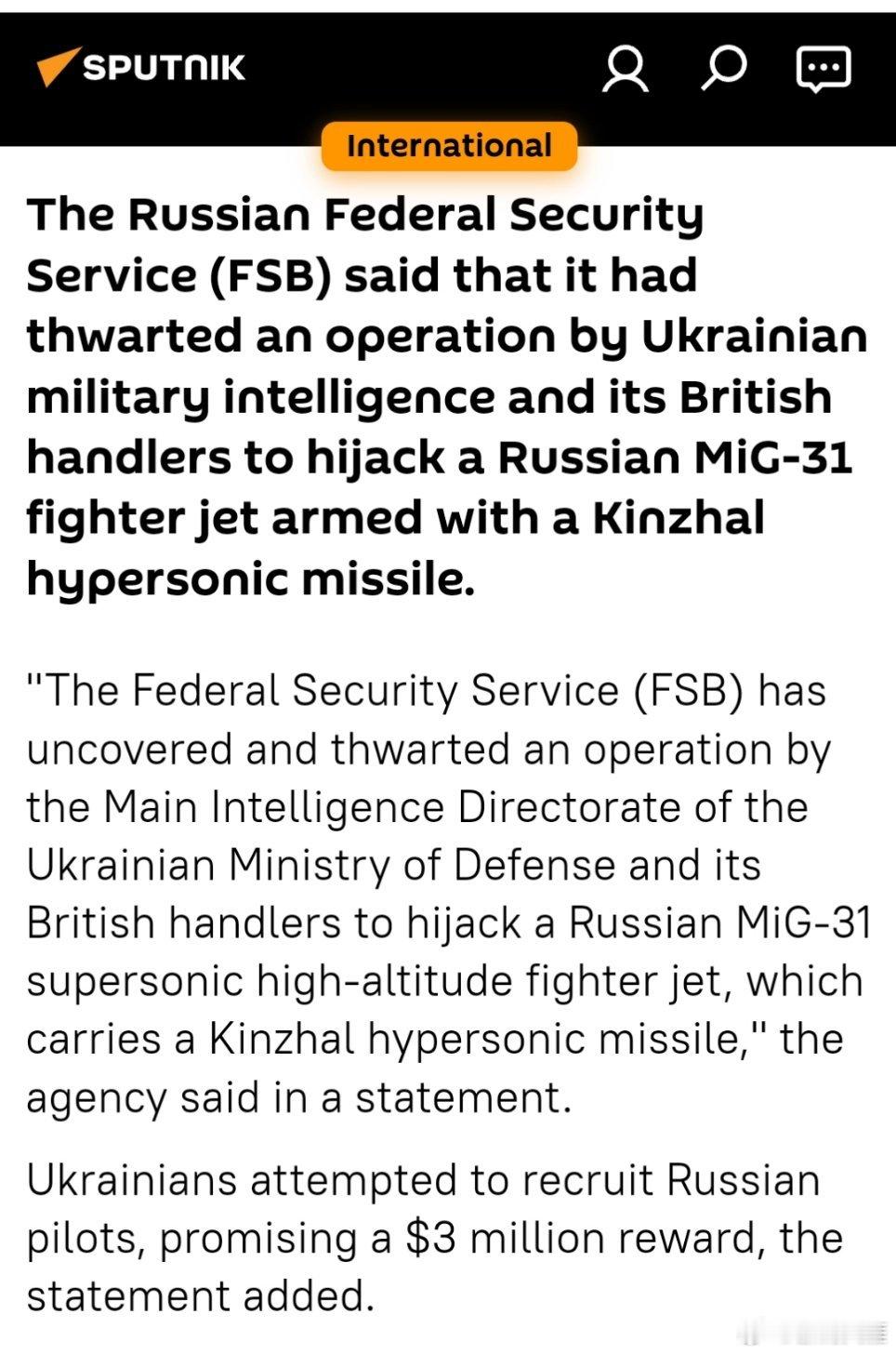 乌英联手劫持俄米格-31战机行动受挫俄罗斯联邦安全局(FSB)称,其挫败了乌克兰军事情报部门及其英国幕后操纵者企图劫持一架装备有“匕首”高超音速导弹的俄罗斯米格 - 31 战斗机的行动。俄罗斯联邦安全局(FSB)在一份声明中称,已挫败乌克兰国防部情报总局及其英国幕后操纵者企图劫持一架携带“匕首”高超音速导弹的俄罗斯米格 - 31 超音速高空战斗机的行动。声明还称,乌克兰人试图招募俄罗斯飞行员,并承诺给予 300 万美元的奖励。(俄罗斯卫星通讯社消息——国际版)