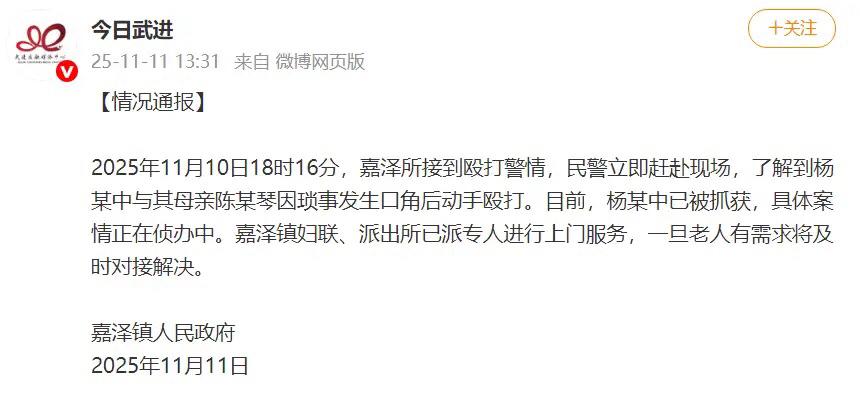 大打出手!扇嘴巴子、打后脑勺、拽头发、摁地上……你能想象这是儿子在殴打妈妈吗?你能想象这是儿子在殴打已93岁的母亲吗?隔着屏幕都感觉得到疼。今日,一段男子暴力殴打老年人的视频在网上引发关注,当得知事件双方为母子后更是引发愤怒声讨。据悉,此事发生在江苏常州市武进区嘉泽镇。打人的黑衣男子是被打老人的儿子,被打得嚎啕大哭的老人已经有93高龄。都说“养儿能防老”,可有这样的逆子真后悔生养了他。目前,当地政府已介入调查。当地官方通报称,杨某中已被抓获,案件正在侦办中。热点 百姓身边事 江苏常州市武进区嘉泽镇一男子殴打亲生母亲引众怒