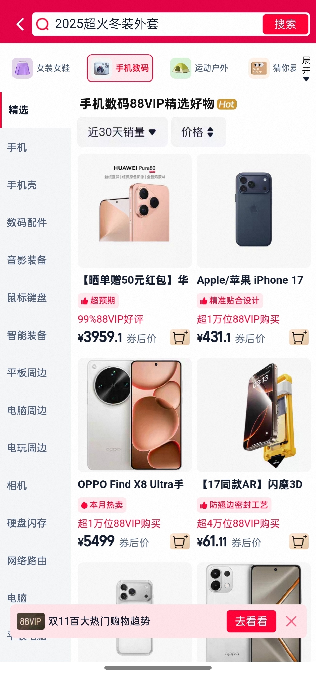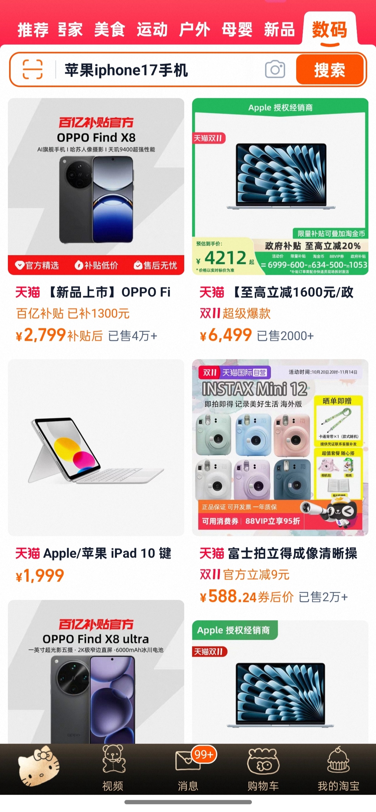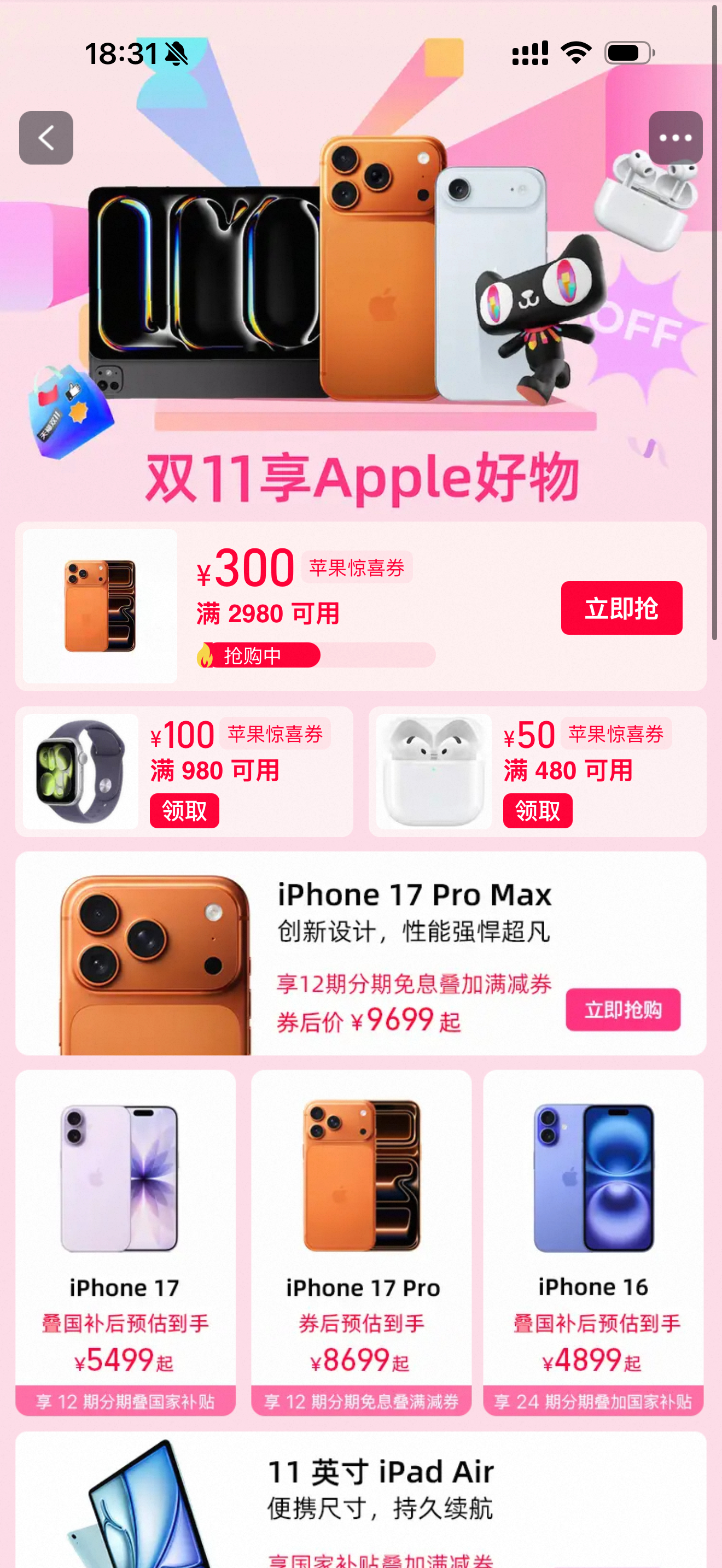 兄弟们,天猫双 11 冲刺48小时,再不下手真的没机会了,错过这波优惠,下次得等明年!主流大牌旗舰手机、电脑、平板、手表等全品类好物,福利来袭!天猫苹果官方旗舰店直降300元起,热门国产旗舰更同步解锁专属优惠价,官方折扣直接享,入手正当时~部分产品还可以叠加88VIP消费券、店铺优惠券、百亿补贴、免息分期,现在下单还能赶上年末最后一波大促,别等活动结束再后悔,冲就完事儿了!!