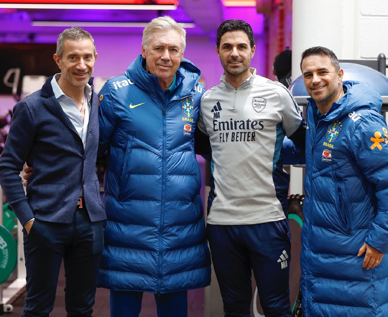 贝尔塔和阿尔特塔在伦敦会见了巴西队主教练安切洛蒂。👋🇧🇷周六,巴西将在酋长球场与塞内加尔进行一场国际友谊赛。🏟️