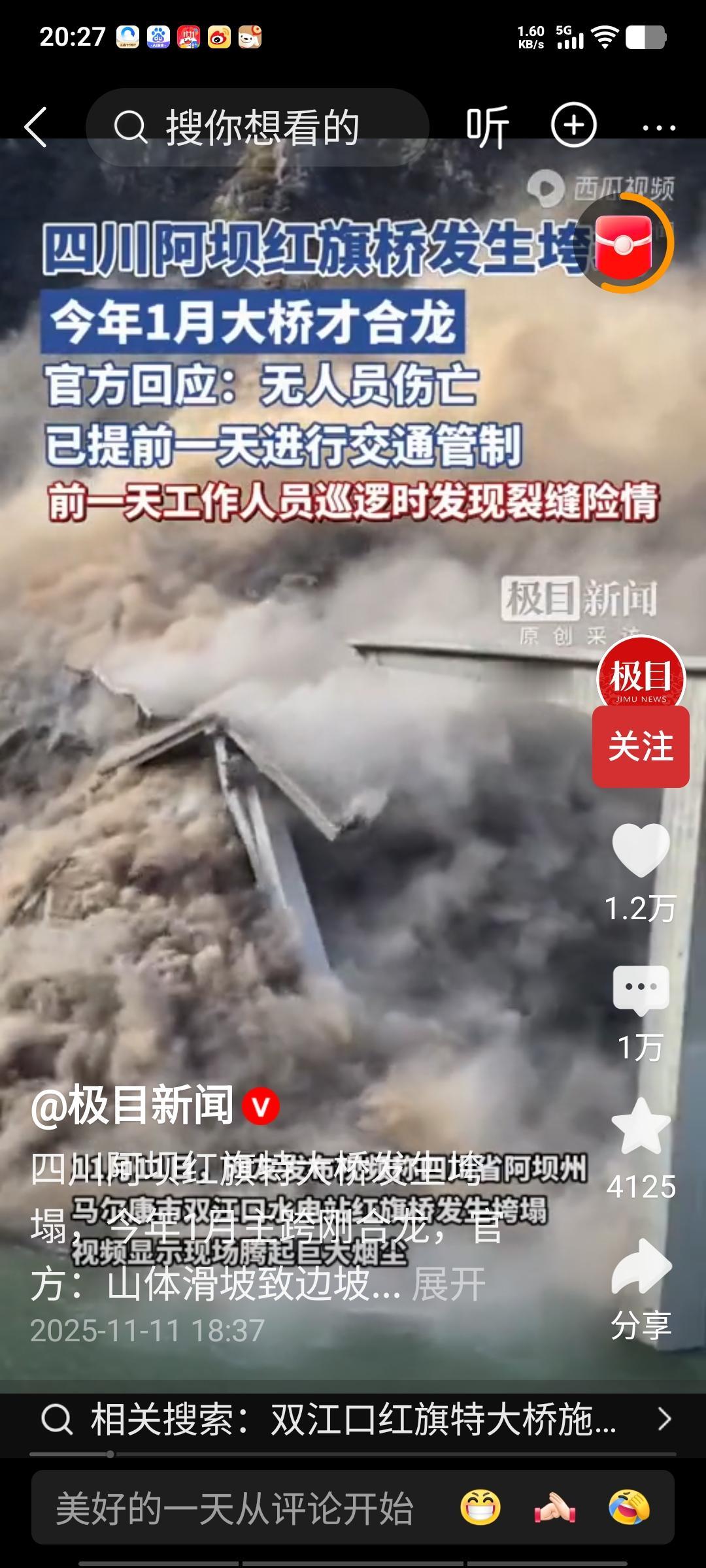 今日,四川阿坝红旗桥突然坍塌。所幸前一日检查人员在桥上发现裂缝,提前实施了道路管控,未造成人员伤亡。需知这座大桥今年一月才合龙,投入运行尚不足一年。在当今科技迅猛发展、中国建桥技术极为成熟的时代,竟出现如此重大事故,着实罕见。推测这或许与设计或施工质量有关,也有可能是地质变化所致。期望建造方查明原因,避免再犯同类错误。