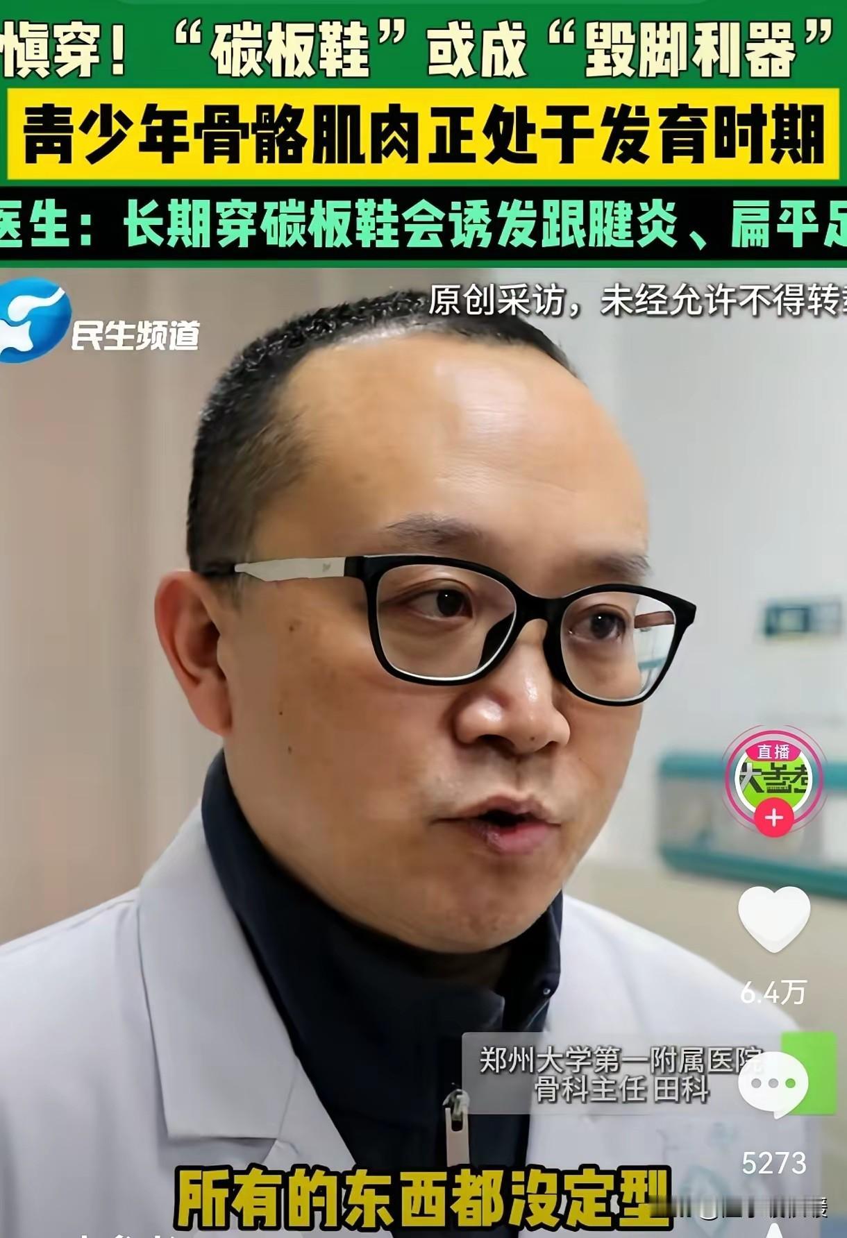 别让“碳板鞋”毁了孩子的脚! "妈,我脚后跟疼..."听到孩子这话,我的心一下子揪紧了。 上周带孩子去医院,骨科诊室里挤满了因穿碳板鞋导致脚痛的学生。一位老医生痛心地说:"这月已经接诊了十几个足弓损伤的孩子,全是碳板鞋惹的祸!" 看着孩子们走路时不自觉地踮着脚尖,后脚跟根本不敢着地,我突然明白了——我们家长正在用爱的名义,亲手伤害着自己的孩子。 为了体育考试那几分,真的值得让孩子承受这样的痛苦吗?当孩子喊脚疼时,我们是否认真倾听过?当孩子走路姿势怪异时,我们是否真正重视过? 每个踮着脚尖走路的孩子,都是在无声地呼救啊! 商家夸大的宣传、学校的无形压力、家长间的盲目攀比...在这场全民跟风中,我们是不是都忘了:孩子健康成长的每一步,都比任何考试分数更重要。 孩子的脚只有一双,别让一时的糊涂,造成终身的遗憾。 资料来源:大象新闻、央视新闻