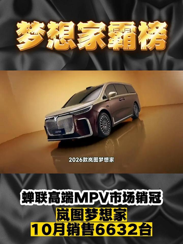 岚图梦想家霸榜,蝉联高端MPV市场销冠。 11月11日,10月汽车销量榜单发布,岚图梦想家以单月6632辆的销量蝉联10月高端MPV销量冠军。自2022年上市至今,岚图梦想家已累计交付超15万辆。 作为全球首款800伏智能超混MPV,2026款岚图梦想家凭借350公里纯电续航和华为乾坤之家ADS、鸿蒙座舱5、智能后轮转向等领先科技,实现三电、豪华、智能的全面进阶。上市18小时大定破1万台,乾坤Ultra版订单占比超50%,单车均价突破40万元,成为高端MPV市场的现象级爆款。 这一表现彻底改写了高端MPV市场的竞争格局。在岚图梦想家出来前,该细分市场长期由合资MPV主导,它成功引领中国品牌实现了豪华车市场的历史性突破。