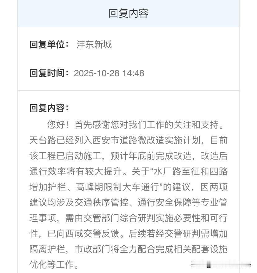 天台路拥堵建议 1. 天台路阿房一路路口、天台路水厂路路口、天台路天台六路路口、天台路征和四路路口,建议将绿化隔离带拆除一部分,增加右转或左转车道,提升通行效率 2. 水厂路至征和四路增加路中间隔离护栏,限制车辆随意掉头 3. 早晚高峰期间,限制大卡车通行。 回复内容 回复单位: 沣东新城 回复时间:2025-10-28 14:48 回复内容: 您好!首先感谢您对我们工作的关注和支持。天台路已经列入西安市道路微改造实施计划,目前该工程已启动施工,预计年底前完成改造,改造后通行效率将有较大提升。关于“水厂路至征和四路增加护栏、高峰期限制大车通行”的建议,因两项建议均涉及交通秩序管控、通行安全保障等专业管理事项,需由交管部门综合研判实施必要性和可行性,已向西咸交警反馈。后续若经交警研判需增加隔离护栏,市政部门将全力配合完成相关配套设施优化等工作。