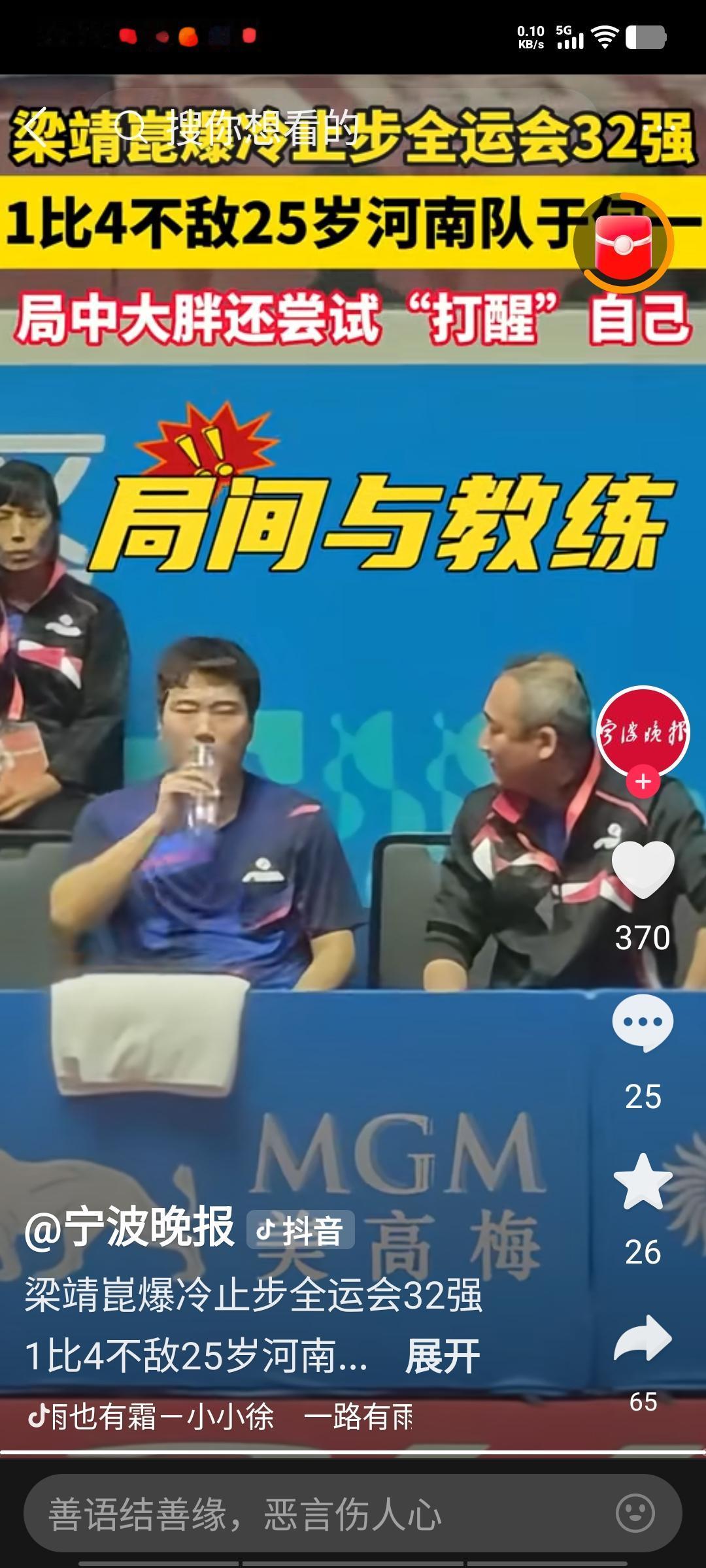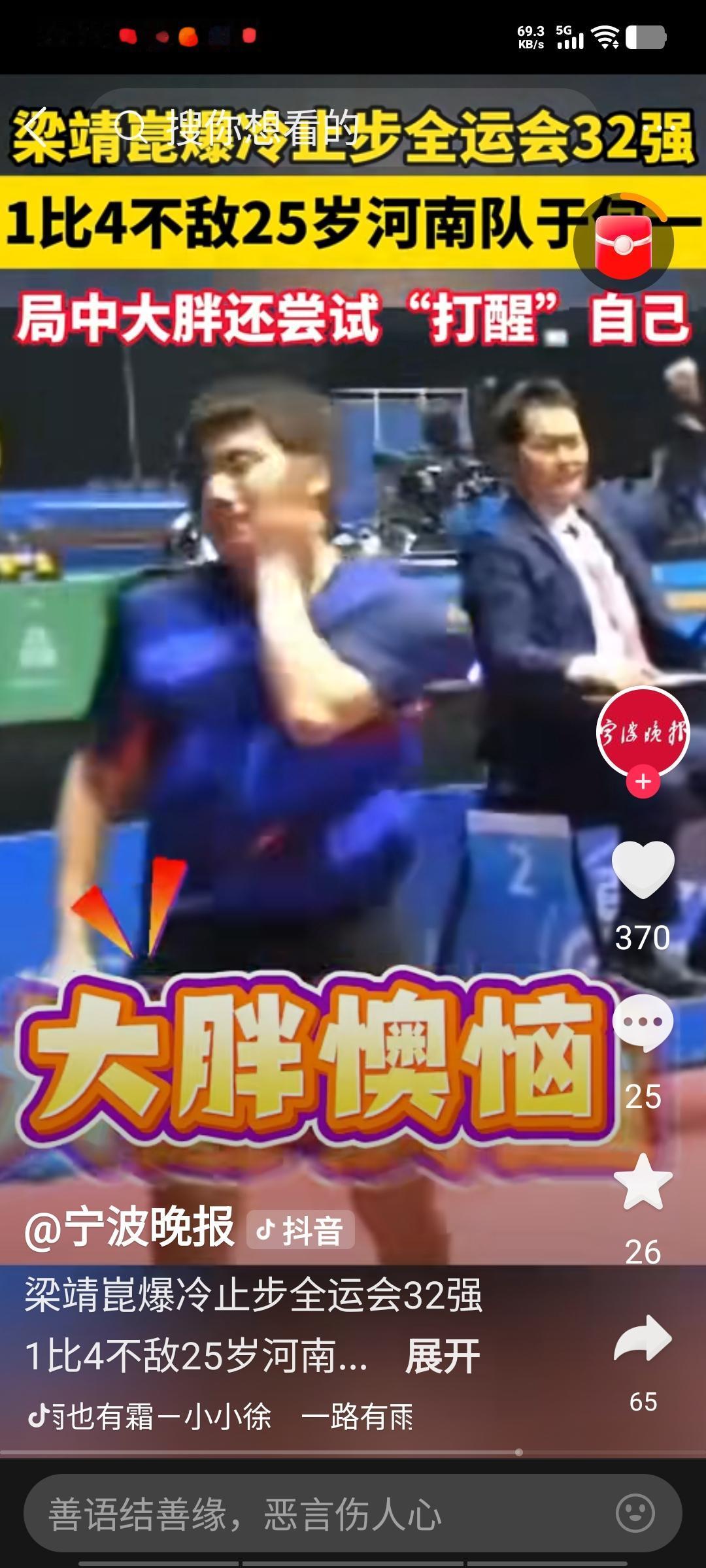 梁靖崑在全运会遭遇一轮游,于十六分之一比赛里,以1比4的比分不敌河南选手于何一,无缘男单16强。四局具体比分为:6比11,7比11,11比9、3比11、13比15。 今晚比赛中,梁靖崑状态欠佳,失误频发,显然准备不够充分。反观河南队的于何一,有备而来,成功限制住了梁靖崑的反手,战术针对性极强,其打法恰好克制梁靖崑。应变稍慢的梁靖崑,被对手打得有些懵。 期望梁靖崑能戒骄戒躁,在今后比赛中稳定发挥,再创佳绩。