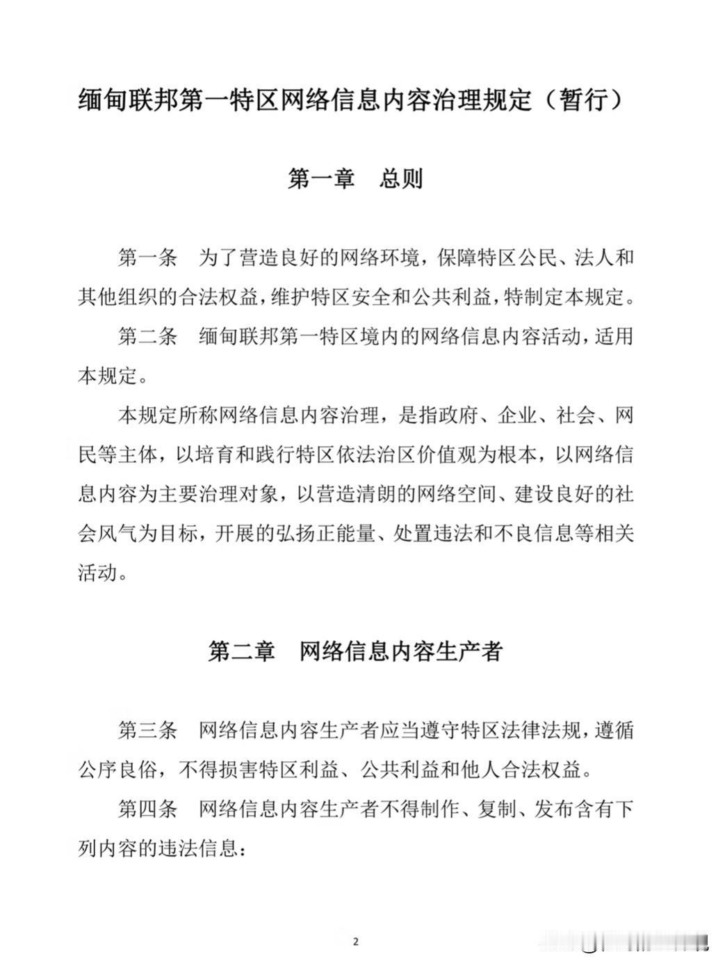 《缅甸联邦第一特区网络信息内容治理规定》于今日实施颁布 该规定首先确立了果敢特区的法律地位,为缅联邦第一特区。 其次,就是以后在特区内制作发布、复制转发互联网内容时,要严格遵守该规定。 第三,实施管制主体包括第一特区警察局和同盟军政治部,以及各级政府参与的行政治安措施。 制定本规定的目的在于保持特区局势稳定,弘扬烈士英雄事迹,引导未成年正确的道德价值观。 同盟军之所以如此快速出台并制定该规定,与德昂和克钦在战场上的失利现状不无关系,同盟军作为率先退出反军政府联盟组织,并与军政府达成临时和平现状。 在民地武和PDF占上峰时具有一定的现实意义,但随着德昂和克钦在战场的节节失利,战火逐步向其辖区靠拢,必定对同盟军辖区造成隐患。 所以说,同盟军当初和军政府签署的停战协定,充满了机会主义色彩。随着昔日盟友的逐渐下落,同盟军处于十分尴尬的局面。出台该规定看似是为了维护特区的稳定,实则是同盟军收容败军和难民的无赖之举!
