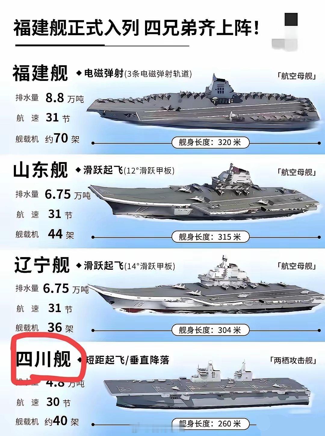 算上四川舰,中国实际已拥有4艘航母。为什么这么说?首先四川舰排水量4.8万吨,规模比法国戴高乐号还大,能搭40余架舰载机;其次配有电磁弹射系统和阻拦装置,堪比福建舰,完全具备起降能力。凭上述两点,说四川舰是航母不为过吧?
