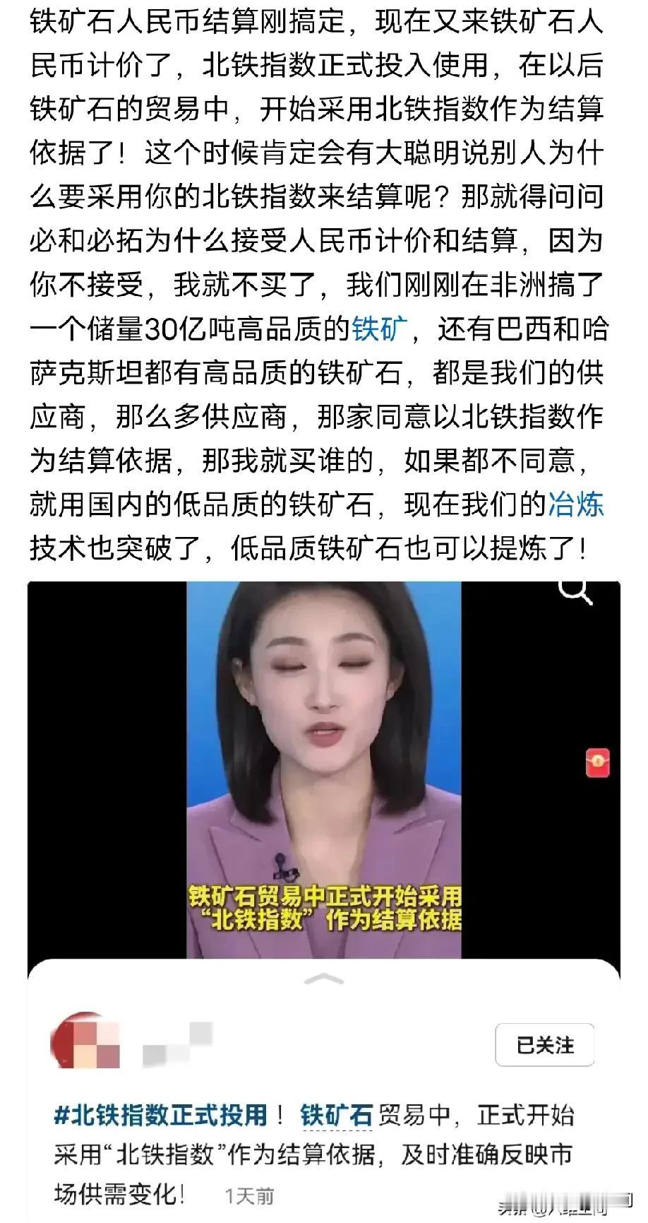 现在我们正在解决在国际上买什么,什么贵的问题,现在铁矿石基本解决了,北铁指数也推出了,彻底解决了铁矿石的人民币计价和结算的问题了!现在军事实力也上来,很多东西都不用真正动手,别人就得忌惮你三分,出去收购别人的矿,自己开采,然后卖到国内来,美国以前就是这个模式,我们现在也开始采用了,只不过我们还是很厚道的,大多情况下只是入股,最多也是控股,不会说让你当事国连一点股份都没有!