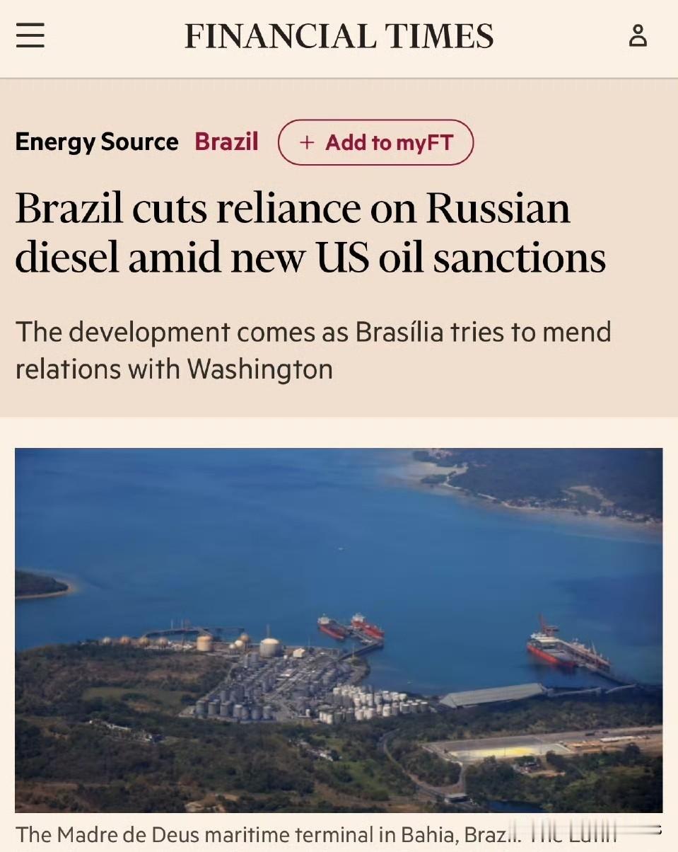 英国《金融时报》川普实施制裁后,巴西已开始拒绝进口俄罗斯柴油燃料。 制裁正在奏