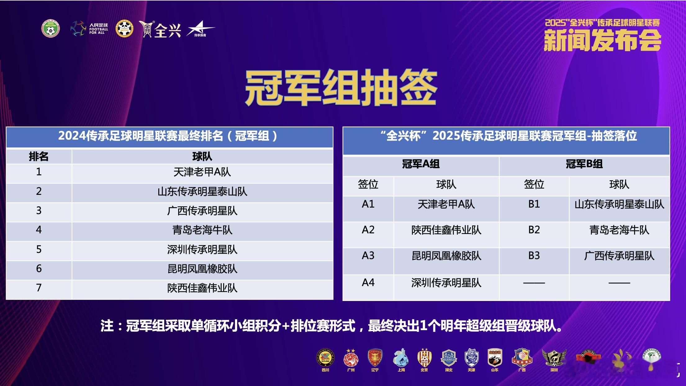 2025“全兴杯”传承足球明星联赛抽签仪式,天津老甲A所处的冠军组抽签结果如下图。各组前两名晋级四强角逐冠军席位,优胜者将升入下届超级组。比赛上下半场各35分钟,每队拥有3次换人机会,换下球员可再次登场。要求上场阵容必须涵盖4个年龄段,36岁-39岁球员最多同时上场2人;45岁以上球员不少于6人;50岁以上球员不少于3人;赛事允许每队报名3名曾效力当地俱乐部的退役外援或从事足球工作的外籍人士,每场比赛同时上场不超过2人。比赛将于12月8日-13日,在成都市双流区举行。天津老甲A队名单正在集结,外籍球员也正在紧锣密鼓的联络。更多详细内容,后期继续同步。