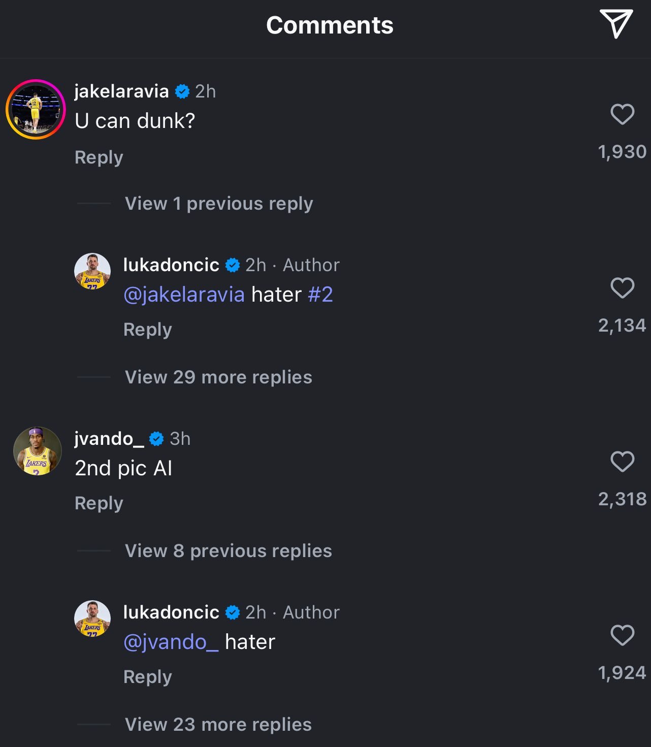 拉拉维亚和范德比尔特在卢卡那条扣篮的Ins动态下留言了🤣🤣77直接回复黑子1号,黑子2号🤣