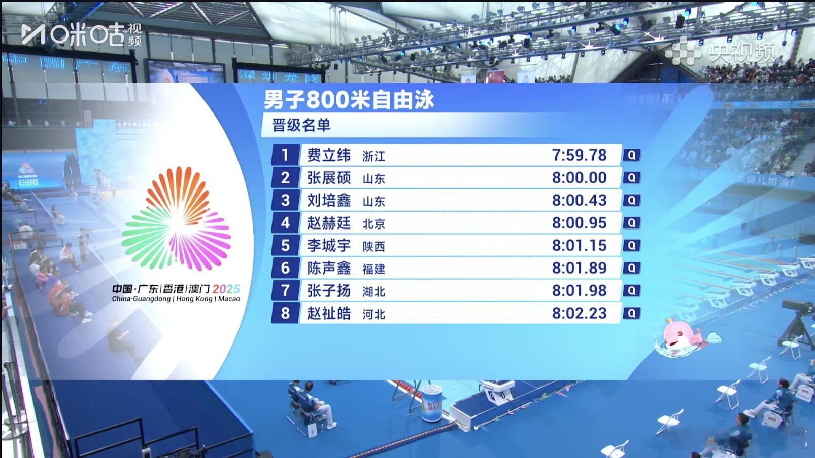 全运会男子800米自由泳预赛,费立纬和张展硕绝对实力。天津队刘丰睿排名第二组第4