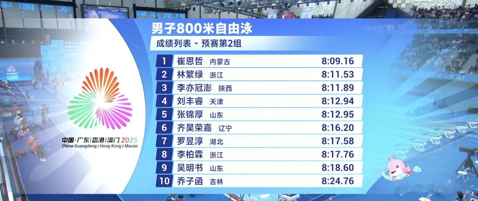 全运会男子800米自由泳预赛,费立纬和张展硕绝对实力。天津队刘丰睿排名第二组第4,未能晋级。