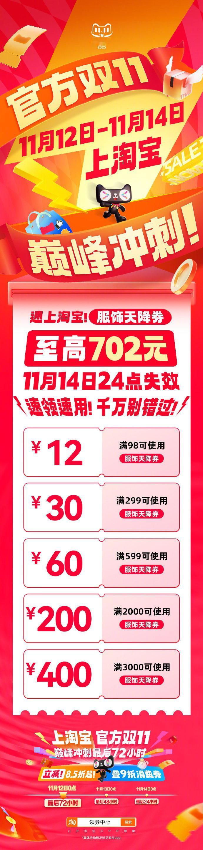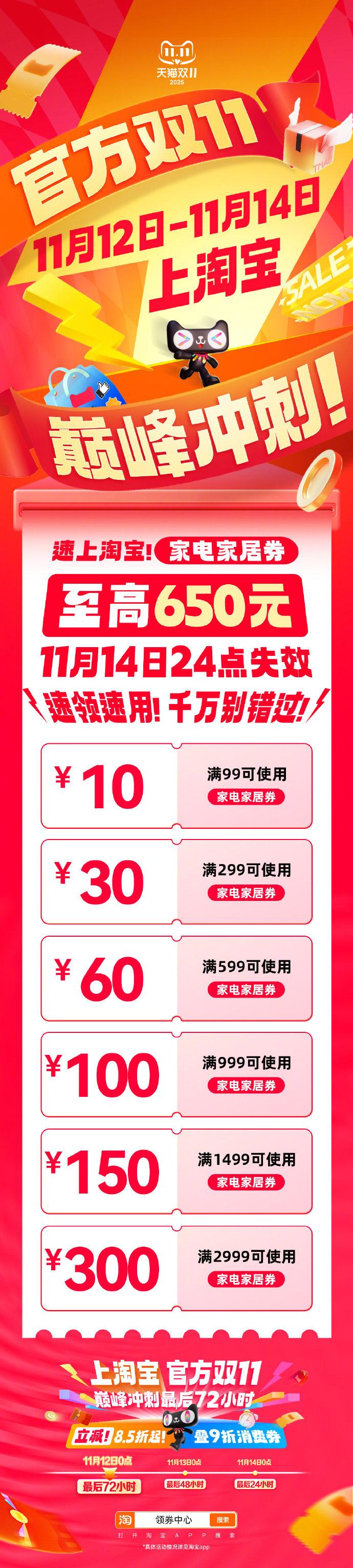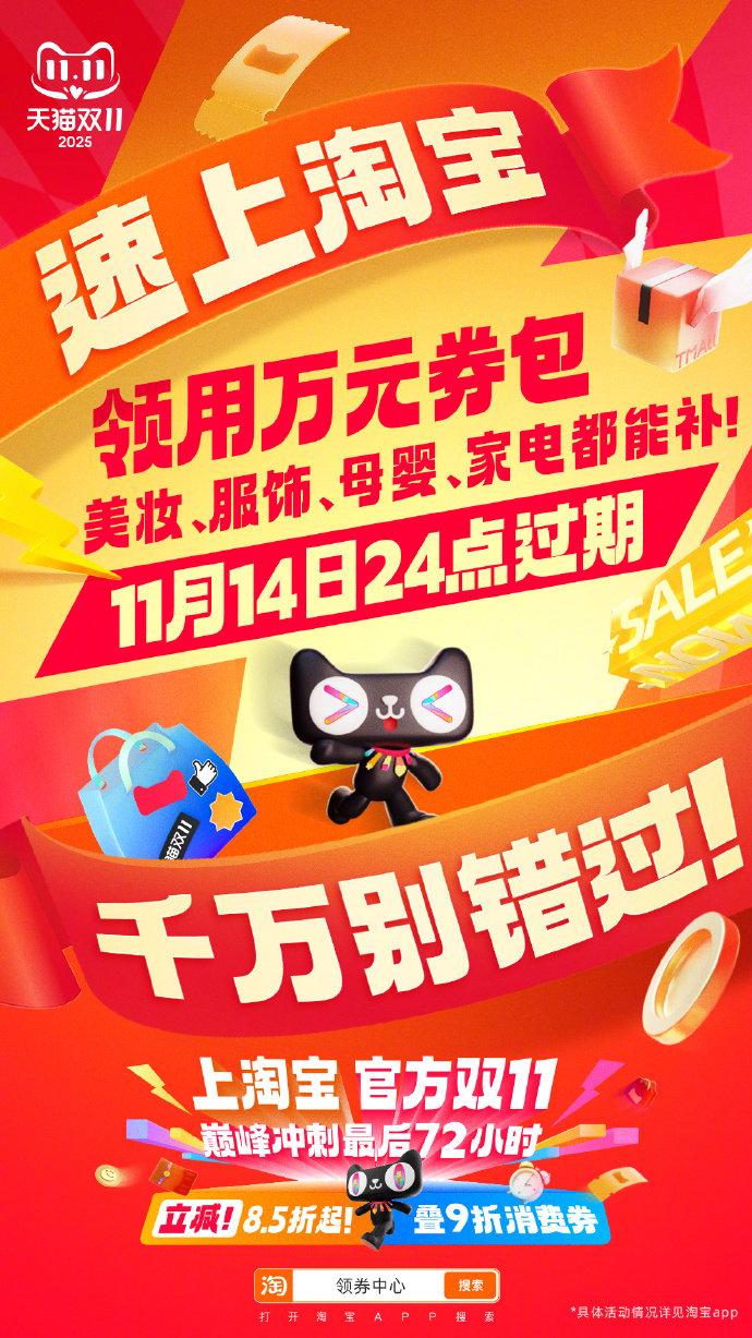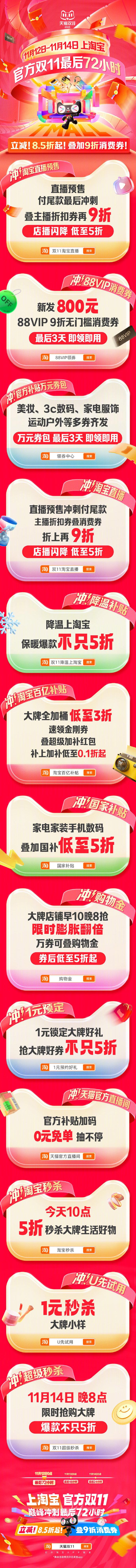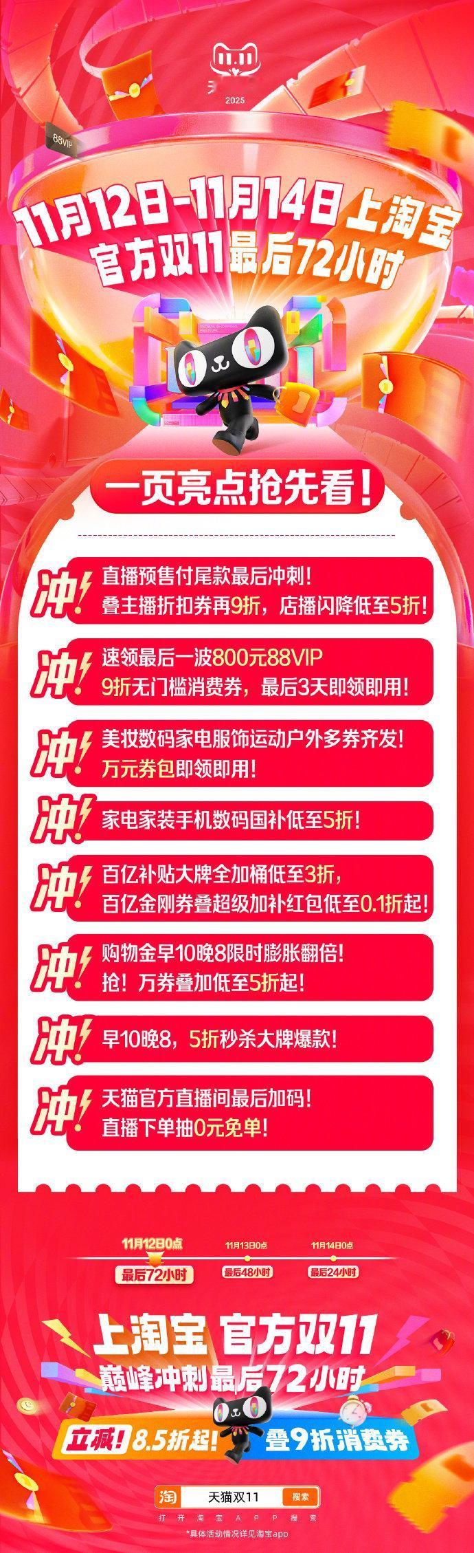 今年双十一首次延长至14日11月12日-14日,天猫双11最后72小时狂欢冲刺开启。今年天猫双11首次将活动时间延长至11月14日,消费者在最后72小时阶段仍可享受多项双11补贴优惠。88VIP9折无门槛消费券即领即用、万元官方补贴券包、百亿补贴低至0.1折、爆款大牌5折秒杀,部分家电家装手机数码产品在国家补贴政策下最低可至5折!多出3天时间查漏补缺,多享3天优惠!