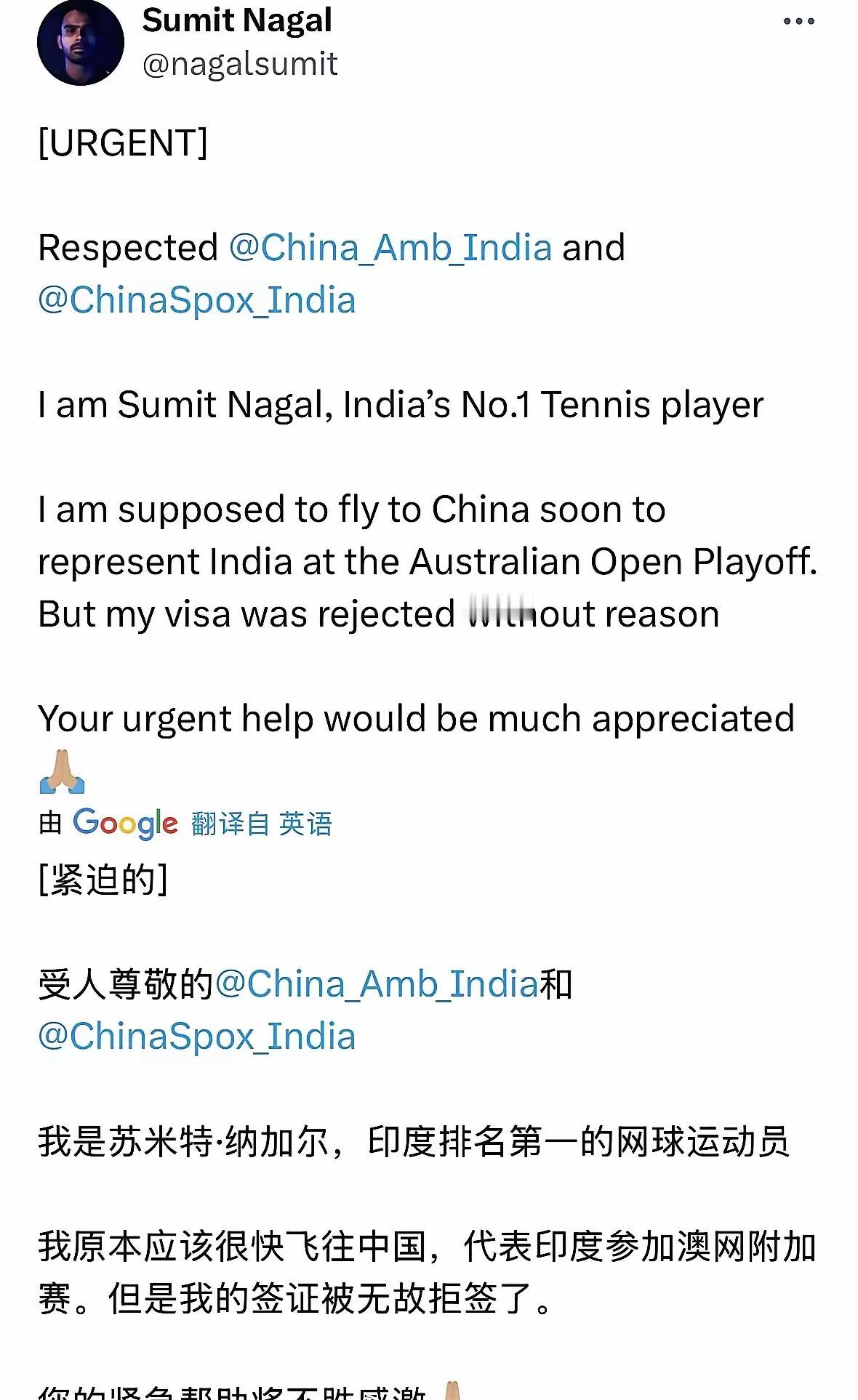 印度网球选手苏米特·纳加尔被中国拒签。他目前世界排名273名,原计划参加澳网附加赛,也就是在成都举行的AO亚太外卡预选赛(11月24日- 29号)。他在X发文求助,希望能来华参赛。 网球场本该是展现体育精神的地方,如今却横亘着一道冰冷的签证壁垒。这位印度排名第一的网球高手,在社交平台向中国驻印度大使馆发出紧急呼救,字里行间满是职业生涯可能被断送的焦虑。 看看纳加尔的战绩吧,他曾站上世界第68位的职业生涯高峰,在澳网击败过种子选手,是印度网球难得的希望。如今为了奔赴成都参加澳网外卡赛,这位球员的梦想却被一纸签证拦在门外。 成都的四川国际网球中心,本应是他争夺澳网正赛门票的战场。这项由澳大利亚网球协会、中国网球协会等机构共同主办的赛事,向来是亚太球员通往大满贯的黄金通道。 体育与政治本该是两条平行线,如今却纠缠不清。当运动员在赛场上挥洒汗水,看客们却在算计地缘政治的得失。这种将体育政治化的短视行为,最终只会剥夺观众欣赏精彩比赛的权利。 纳加尔的遭遇令人深思:体育的纯粹性究竟该如何守护?当他公开呼吁“无故被拒”时,我们听到的不仅是一个运动员的困境,更是体育精神在政治阴影下的叹息。 这场外卡赛的赛场,中国选手也将与各国好手同台竞技。体育的本质在于搭建桥梁而非筑起高墙,这一点永远不该被遗忘。 体育竞赛的魅力,恰恰在于它能超越国界,让人类最纯粹的拼搏精神在赛场上闪光。将体育捆绑上政治战车,最终只会让全世界的体育爱好者失望。 各位读者你们怎么看?欢迎在评论区讨论。