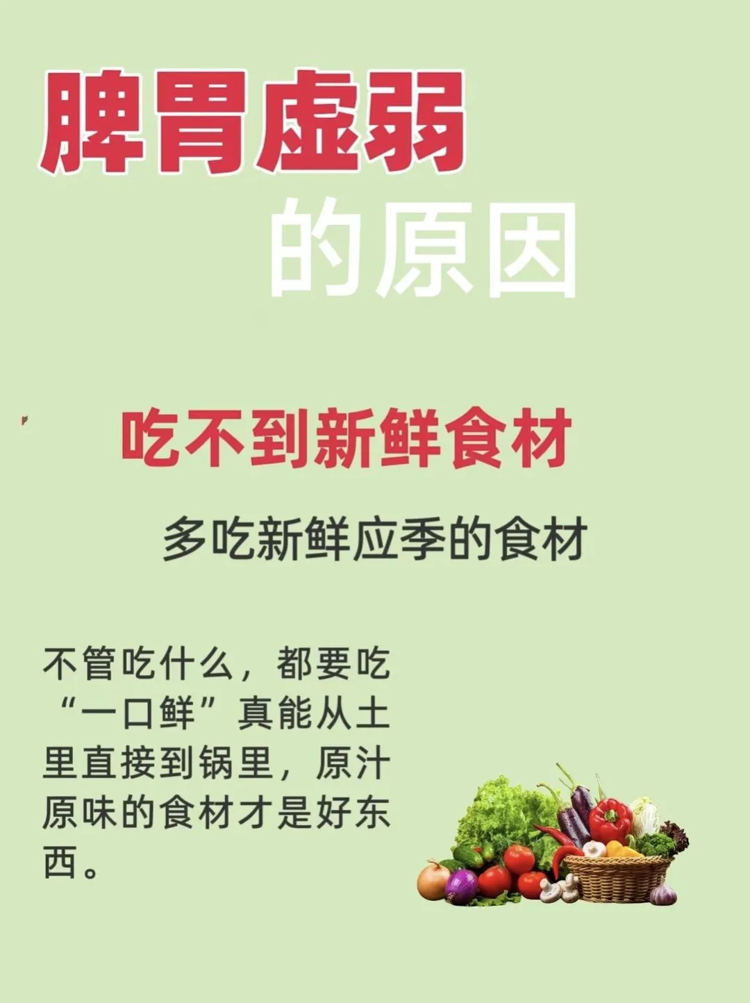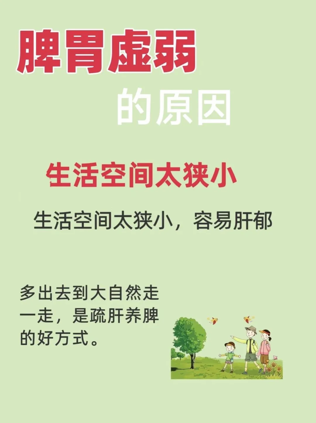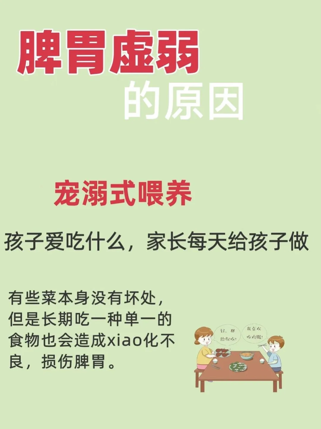 1.吃的太好 虽然肉类高蛋白很有营养,但是在饮食结构中所占比例只有3五分之一,要适量吃,而且越有营养的东西越难消化,还容易生内热,建议放在中午吃。 2.吃不到新鲜食材 不管吃什么,都要吃一口鲜,原汁原味的东西是好东西。 3.吃过多寒凉食物 寒凉是脾胃的大忌,包括寒性的水果,夏季的冷饮雪糕,还有寒凉的药。 4.宠溺式喂养 有些食物本身没有坏处,但是长期吃一种单一的食物也会造成消化不良,损伤脾胃。 5.生活空间太狭小 容易肝郁,多出去到大自然走一走,是疏肝养脾的好方式。