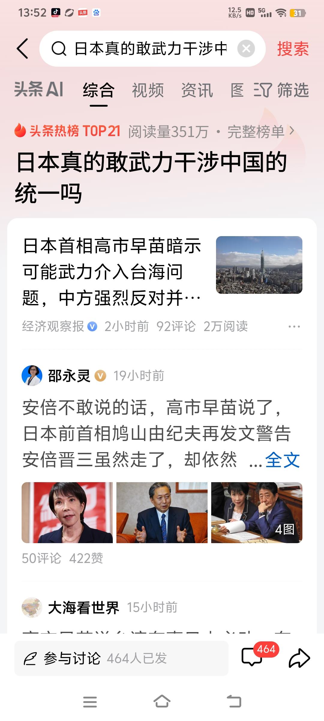 日本可能真的敢武力干涉中国武统台湾! 近日,日本女首相高市早苗暗示可能武力介入台海问题的言论,引起了中国的强烈反对与交涉,广大网友也纷纷讨论日本是否真的敢武力干涉中国武统台湾。 有许多网友认为日本和中国之间现在军事实力差距巨大,日本并不敢真的武力干涉中国武统台湾,日本所谓武力介入台海问题不过是逞口舌之快罢了。 如果我们中国对日本武力介入台海问题,都是这样认识的话,那是非常错误和危险的。因为日本是个岛国,日本的终极目标就是对中国进行亡国灭种,然后日本到中国来生存,他们的这个目标千年未变。 不要认为日本的军力不如中国,他们就不敢动手。唐朝、明朝、甚至清朝,中国的军力都比日本强吧,日本依然对中国动手了。还有在二战期间,日本在被中国拖得精疲力尽的情况下,日本还是偷袭了当时世界第一军事强国、美国太平洋舰队的军事基地珍珠港。 因此,对于高市早苗之流的日本政客涉台的不当言论,中国不仅要在外交上进行反对交涉,更是要在军事上时刻做好应对日本动手的准备,甚至做好核爆日本的准备也不为过!