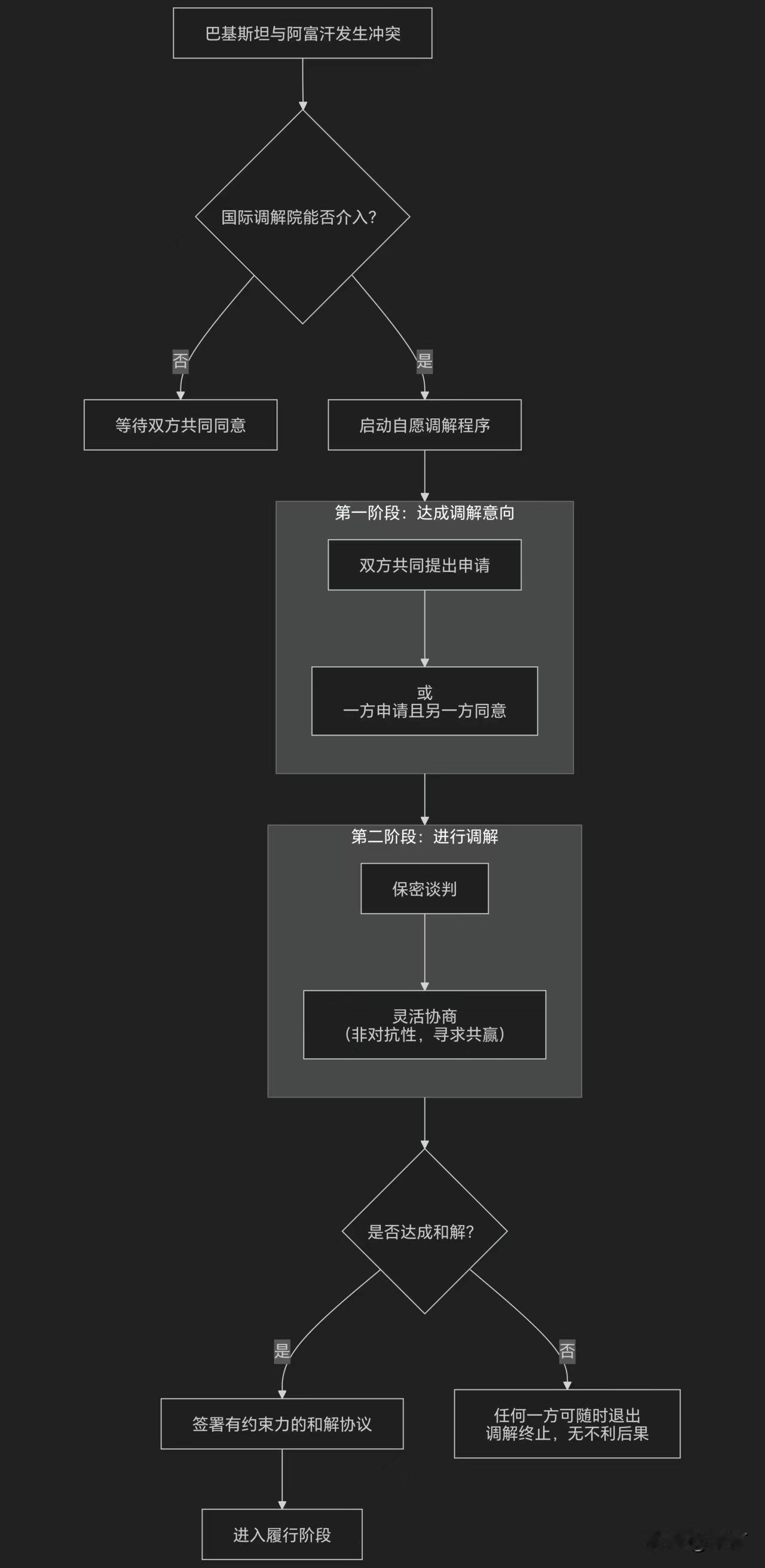 误解了:原来国际调解院不为“拉架”,只为“谈心” 近日,巴基斯坦与阿富汗之间有一些摩擦。作为国际调解院创始成员国的巴基斯坦,为何不通过这个新平台来解决争端呢? 仔细研究了国际调解院的工作流程。我发现我们可能对它的工作目标存在误解。 我们通常理解的是,两个国家“打起来”的时候,国际调解院应该主动去“拉架”。但根据《关于建立国际调解院的公约》,调解是遵循“自愿原则” 争端双方都同意并申请调解,程序才能启动。这就更不理解了,如果打架的双方都自愿请人来“拉架”,那说明他们本来就不想打了,又何需外人调解呢? 进一步深入研究后我发现,原来国与国之间的关系远比街头打架要复杂。国际调解院的工作重点,不是“拉架”是打完架之后,如果双方有需要,陪着双方坐到一起“谈心” 通过“谈心”了解双方产生冲突的根源,帮助双方协调打架之后的赔偿等事宜。让双方从内心能够化解仇恨,从心灵上去修复关系。最终让和平能够持久下去。