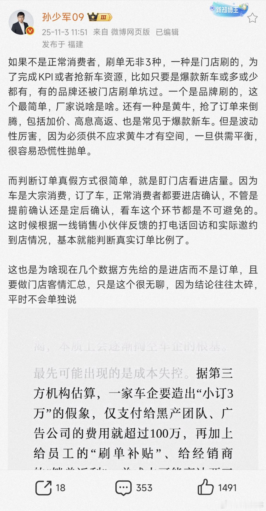 车企5元买个“假车主”刷出大订破十万,就为了忽悠客户真买车“新车上市72小时小订破X万”“48小时订单超X万”,现在的车上市要没这种新闻来证明自己人气有多旺,感觉都没法和媒体交待,而消费者也吃这套,很多人买车的时候会看新车的订单数据,就想着既然是大家都看好的东西,肯定是好东西,跟风买总没错。讽刺的是,就在最近,汽车博主“孙少军09”再次转发评论新车上市小订数据造假的新闻。你能想这些看起来很牛的数字可能掺了一半的水分?“孙少军09”一针见血的指出,看官方报的小订数字没用,不如看4S店的进店量,这才是真实的。毕竟买棵白菜还得挑一挑呢,更何况是汽车这种大件儿,谁还不得进店去看看实车,确认一下细节?而这可不是车企的“独角戏”,而是由车企,4S店和经销商,以及黄牛的“集体表演”。车企好理解,领导要业绩,投资人看增长,股价也得稳得住,自然要喊个“破万”的口号来撑撑门面,最后压力给到了营销部门,花钱买数据最简单直接,5块钱买一个“用户”,要想更真点,花15块钱能买一个有真实地址和模拟咨询记录的“高品质用户”,这样一来花个两三百万就能造出一个“小爆款”。至于4S店和经销商,为了能多分到点车,多拿点返利,完成厂家KPI,干脆自己刷单,什么自己的,亲朋好友的账号都利用起来,大不了最后把定金一退,先把数据刷起来再说。黄牛的目的就更简单了,看到哪个车关注度高,抢一波再说,然后再加价卖给那些急着提车的人,从中就能赚上一笔。那么这场戏最后坑的是谁?毫无疑问,就是我们这些普通消费者。很多人就是信了“小订破万”去跟风买车,结果车机卡得像10年前的老人机,标称的续航也掺着大量水分,想去车友群里吐个槽,里面没几个活人。更坑的是因为真实销量差,售后也跟不上。想卖二手都没人买。你以为车企就是赢家?大错特错。花几百万去买这种虚假繁荣,等到想优化车机系统,搞研发的时候,反而没了钱。领导看到刷出来的销量还挺开心,寻思再扩产多造点车,最后就只能卖不出去“挥泪大甩卖”,然后再背刺一波老车主。更糟糕的是,刷单要成了整个行业的风气,大家都把精力用在这种地方了,谁还愿意把功夫下在搞研发创新上?那中国汽车赖以发展的根基就被破坏了,而且中国汽车要想长远发展,出海是必经之路。像欧盟等市场对厂商诚信要求很严,订单交付数据的来源和标准都要公开的,一旦因为不诚信被这些国外市场拉黑,那损失可就大了,还会损害中国汽车在国外消费者心中的形象。要想治好订单造假的毛病,监管部门得赶紧制定一个统一标准来约束这些车企,把小订,大定,交付之类的名词都规定的清清楚楚,明明白白,哪个车企也别想玩文字游戏,谁敢在数据上造假,就重罚谁,罚到它不敢再犯,第三方机构也要把上牌量,投诉率等关键数据公布出来,让消费者看清哪些车是真的热销,哪些车是吹出来的。当然车企自己也要想明白,靠5块钱一个的假用户撑起的假繁荣是走不长远的,“狼来了”喊多了就没人再信了。好好把精力放在搞技术,做服务上比啥都强,这样才能在国内站稳脚跟,在国际上获得认可。