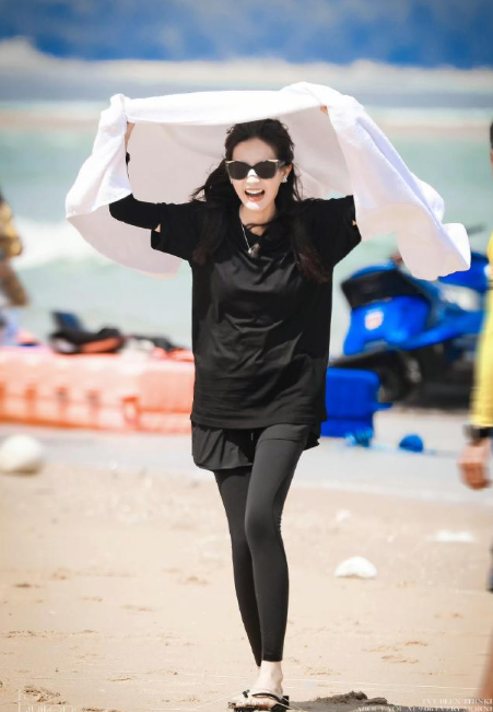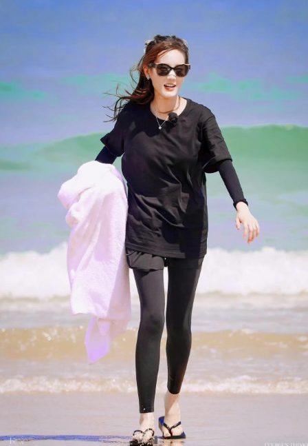 李一桐,墨镜沙滩一字拖 随性自由的样子也非常美丽