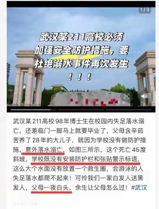 27岁博士冯某某,前脚刚跟女友庆祝完“恋爱四周年纪念日”,第二天,在校内溺水身亡。警方通过勘察,排除刑案,基本确实意外落水。 这起突如其来的悲剧,像一记重锤击碎了无数人的心,也再次让我们反思生命的脆弱与无常。27岁的冯某某,刚刚用自己的努力和坚持,迎来了爱情的四周年纪念日,本应是幸福和希望的象征,却在第二天的意外中戛然而止。那一瞬间,所有的美好都变得如此遥远,只剩下无尽的惋惜和不舍。 或许,很多人在看到这样的新闻时,第一反应是震惊、愤怒,甚至是疑问:生命为什么如此脆弱?我们拼尽全力追求梦想,却在不经意间失去了最宝贵的东西。可是,深究之下,我们更应该看到的是生命的珍贵和脆弱背后隐藏的那些不为人知的故事。 冯某某,作为一名年轻的博士,代表着无数有志青年对未来的无限憧憬。他的离去,让我们不禁反思:在追求学业、事业、爱情的同时,我们是否也忽略了生命中那些看似平凡却极其重要的安全细节?生活中,危险或许就在不经意间悄然降临,没有人能预料到下一秒会发生什么。 这起事件,也提醒我们:生命没有重来一次的机会。每一次的意外都在告诉我们,要更加珍惜当下,关注身边的人和事。我们常常忙于奔波、追逐,却忘了停下来感受生活的温度。也许,我们都应该学会在日常中多一份警觉,多一份关爱,因为,生命的脆弱,随时都可能让我们措手不及。 悲剧固然令人扼腕叹息,但它更应成为我们每个人的警钟。让我们在追求梦想的同时,也不忘守护自己和身边的人。因为,生命只有一次,错过了,就再也无法弥补。愿冯某某安息,也愿每一个在生活中努力前行的人,都能平安、幸福。大学生身亡 大学溺亡 男大学生之死