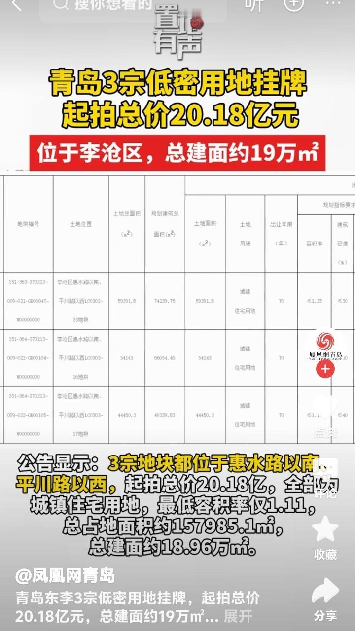 青岛东李三地块引爆楼市狂想曲!惠水路旁黄金宝地暗藏城市新贵密码,低密生活即将改写李沧版图 当青岛楼市还在为金九银十的余温争论不休时,李沧区东李板块突然甩出一张重量级王牌。三宗低密宅地如同三颗深水炸弹,在初冬的房地产圈掀起惊涛骇浪。起拍总价超20亿的豪气手笔,背后是城市发展蓝图向东倾斜的明确信号,更是无数家庭安家梦想的又一次集中绽放。 这片位于惠水路以南、平川路以西的黄金区域,仿佛一夜之间被推至聚光灯下。总面积约15.8万平方米的土地,规划总建筑面积近19万平方米,却保持着最低仅1.11的容积率。这意味着什么?在寸土寸金的城市里,低密度社区将不再是远郊的专属,而是即将崛起于成熟城区的生活新范式。 细看这三宗地块的指标,犹如阅读一本精心设计的人居美学著作。LC0302-33地块以7.42万平方米的建筑面积成为体量担当,1.25的容积率预示着这里将诞生错落有致的建筑群落。而LC0303-17地块1.11的容积率,几乎达到了低层洋房社区的极致,注定将成为改善型购房者眼中的稀世珍品。 起拍楼面价10520-10940元/平方米的数字背后,是精明的市场定价艺术。这个价格区间既考虑了当前市场的承受能力,又为未来价值提升留足了想象空间。在青岛城市更新的大背景下,这样的定价策略无疑是在向市场释放积极信号——东李板块的价值认知正在被重新定义。 放眼地块周边,教育、医疗、交通配套已然成熟。多所中小学环伺,地铁站点近在咫尺,体育文化设施一应俱全。这种“出生即成熟”的先天优势,让其他新兴板块望尘莫及。当生活便利性与低密住区完美结合,产生的化学反应足以改变一座城市的人居格局。 对于敏锐的投资者而言,这次土拍更像是一场城市发展红利的提前分配。东李板块作为李沧区重点发展的城市功能区,其基础设施投入和产业导入已进入收获期。此时出让优质住宅用地,恰似在果实最甜美的时刻进行采摘,无论是开发商还是购房者,都能分享这波发展红利。 从购房者视角看,这三宗地块的出现恰逢其时。当前改善型需求正成为市场主力,人们对居住品质的追求已从“有的住”升级为“住得好”。低容积率意味着更宽阔的楼间距、更丰富的绿化空间、更从容的生活节奏,这正是当代城市精英梦寐以求的生活场景。 这场土拍的意义早已超越简单的土地交易,它更像是对青岛城市发展方向的又一次校准。当核心区域的低密地块陆续释出,表明城市更新正在从粗放式扩张转向精细化运营。这种转变背后,是对土地价值最大化的理性思考,也是对市民宜居诉求的真诚回应。 随着12月2日拍卖日期的临近,这三宗地块的命运牵动着无数人的心。无论是志在必得的开发商,还是伺机而动的购房者,亦或是关注城市发展的普通市民,都在期待这场土拍能给出关于青岛楼市未来的明确答案。而这答案,或许就藏在惠水路旁那片待价而沽的土地里。 (来源:青岛市自然资源和规划局、观点地产网、凤凰网青岛)