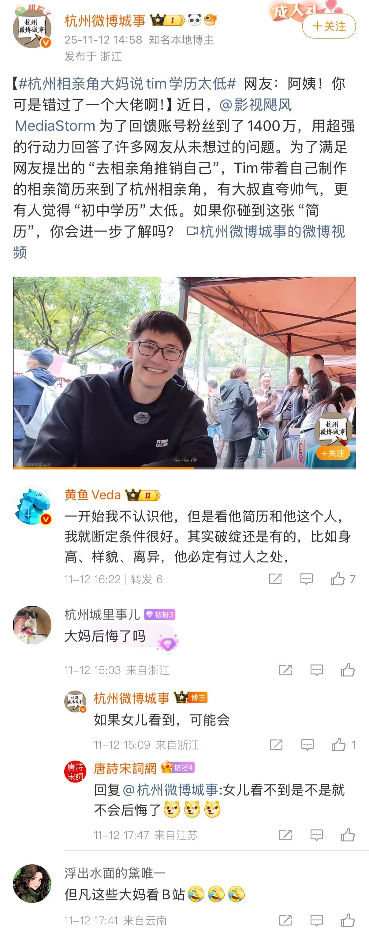 刷到影视飓风“整活”去相亲角的一段视频,简单来说就是他作为一个收入很高学历不错父亲更是很有钱的一个人,真话假说给自己弄了一个“不入流”的相亲简历,不出意外地在相亲角遭到了大妈们的拒绝然后果不其然相关评论很多都是“大妈后悔了吗”“如果她女儿看到要急死了”………………神经啊真是神经啊,这个整活何意味,演康熙微服私访享受把陌生素人放在网上等知道你身份的人做你赛博评选呢?明知道这种简历得到的结果有什么意思呢难道你公司招揽员工你看到初中学历也会耐心试用吗?难道别人给你介绍这种简历的女性你也会很感兴趣吗?