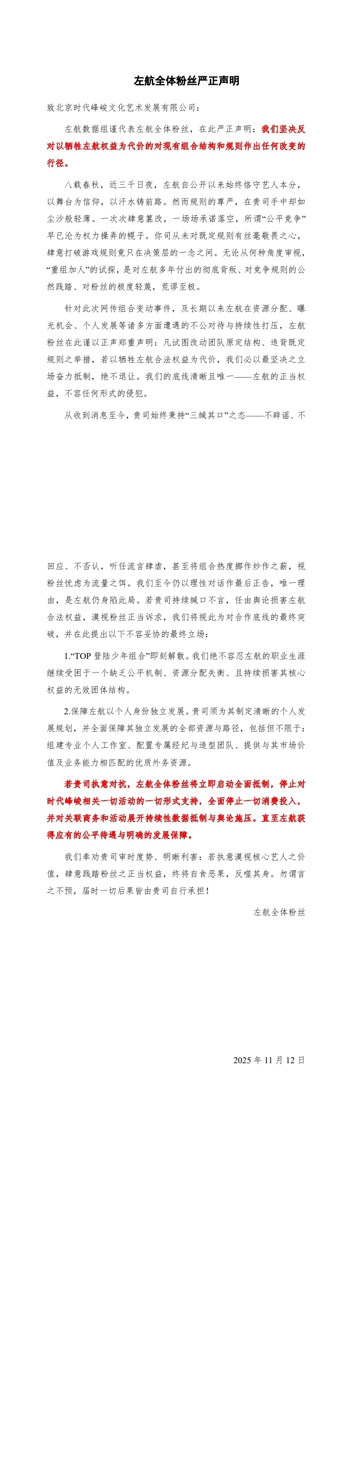 朱志鑫粉丝告时代峰峻书拒绝任何除朱志鑫单飞以外的组合人员及站位变动,拒绝任何影响