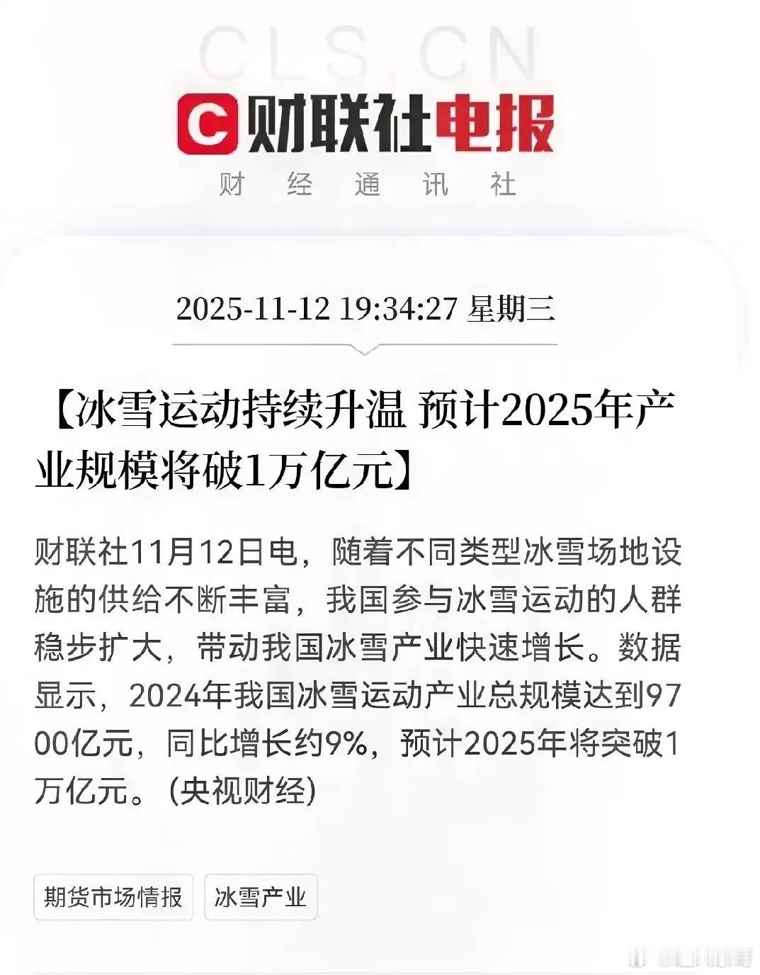 盘后这一板块迎来利好!财联社消息显示,我国冰雪产业正进入高速增长期:2024年产