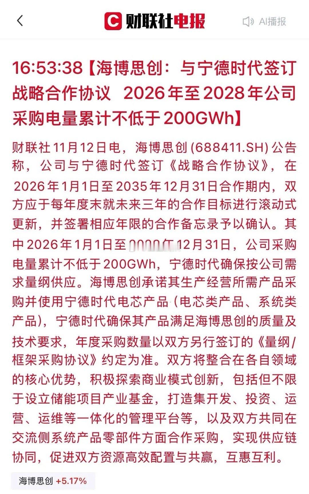 重磅!储能巨头强联合!“海博思创”与“宁德时代”锁定200Gwh天量订单!盘后,国内储能系统集成龙头“海博思创”发公告称:已与全球电池巨头“宁王”(宁德时代)正式签署为期十年的战略合作协议。这一超长期绑定,不仅彰显双方对储能产业高景气的坚定信心,更被市场视为一剂强劲的“价值催化剂”。根据合作内容,仅前三年(2026~2028年)海博思创就将向宁德时代采购不低于200GWh电池。这一“天量订单”规模远超许多同行全年出货量,为公司未来项目交付奠定坚实基础。更重要的是,宁德时代承诺“确保供应”,这意味着在行业可能面临电池紧缺的背景下,海博思创已锁定核心资源,供应链韧性成为其最大竞争优势之一。双方的合作还不止于买卖,将共同设立储能产业基金,打造“投资-建设-运营”一体化平台,从项目开发中共享长期收益!并且在非电池零部件上联合采购,通过规模效应降本提效。这种深度协同有望显著提升双方毛利率水平,增强盈利确定性。本次合作进一步强化“龙头结盟”的行业趋势。海博思创凭借供应链保障与成本优势,有望加快市场份额提升;宁德时代也锁定了未来十年重要的产能出口。这一组合很可能挤压中小厂商生存空间,推动产业集中度持续上升。对“海博思创”而言,这份协议直接扫除了市场对其未来电池供应与成本控制的担忧,极大增强了业绩能见度与成长确定性。预计将显著提振投资者信心,可能推动估值修复乃至重估。对宁德时代来说,长达十年的百GWh级大单,是其储能业务增长的坚实基石,进一步巩固其电池龙头地位,彰显其从“供应商”向“生态共建者”的战略升级,对稳定股价有积极意义。