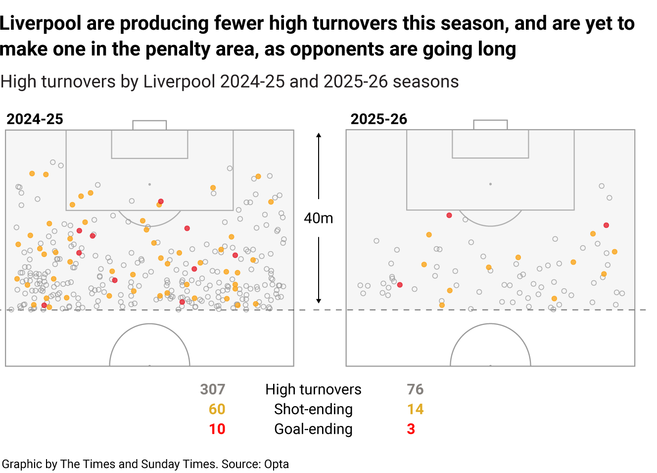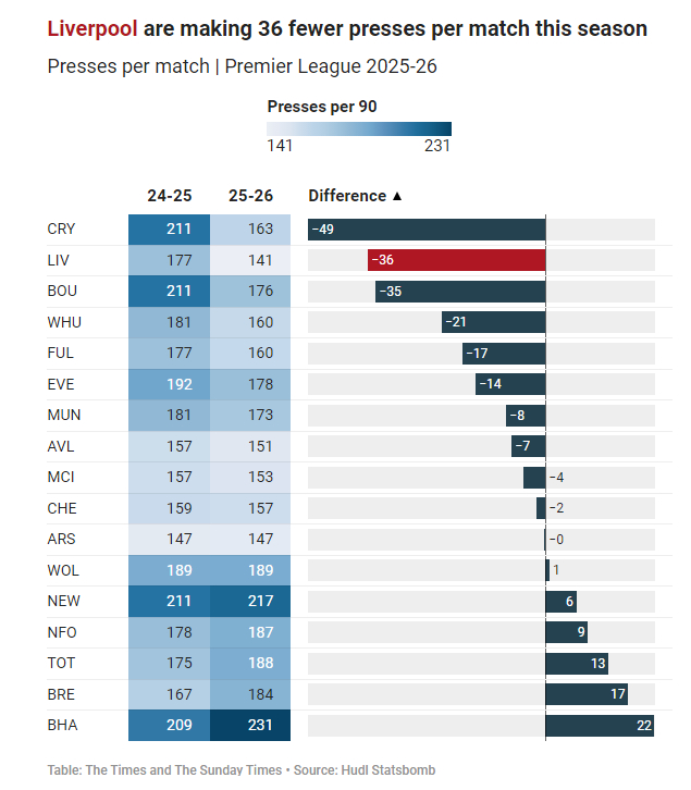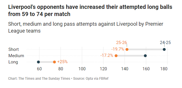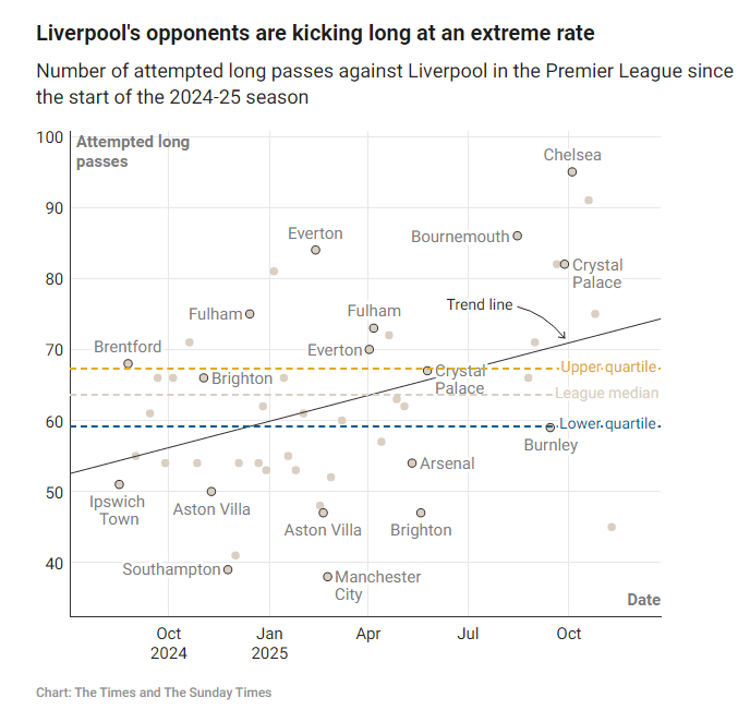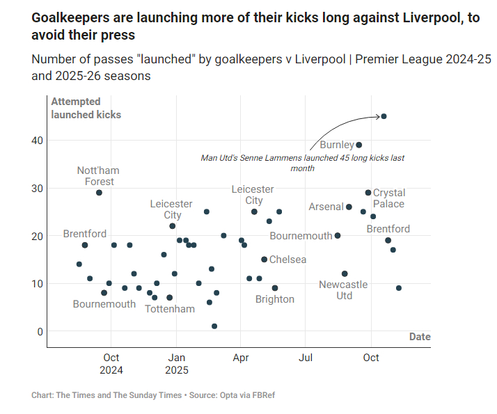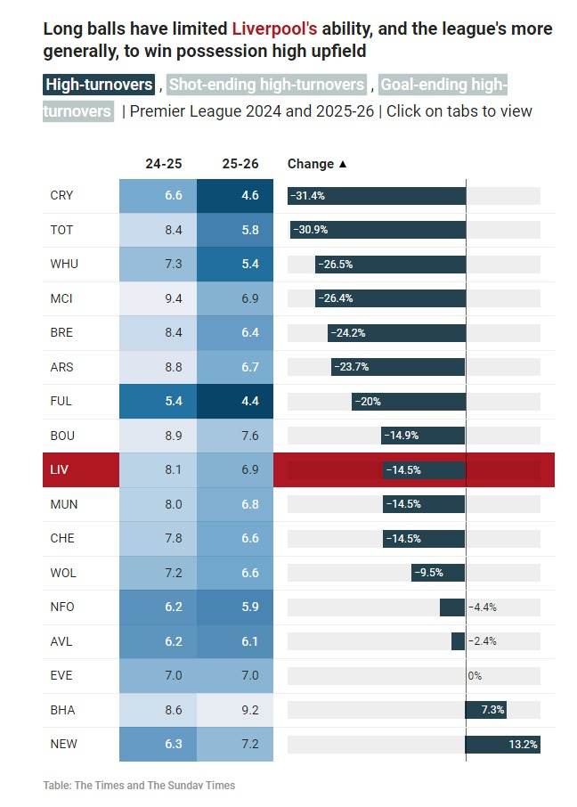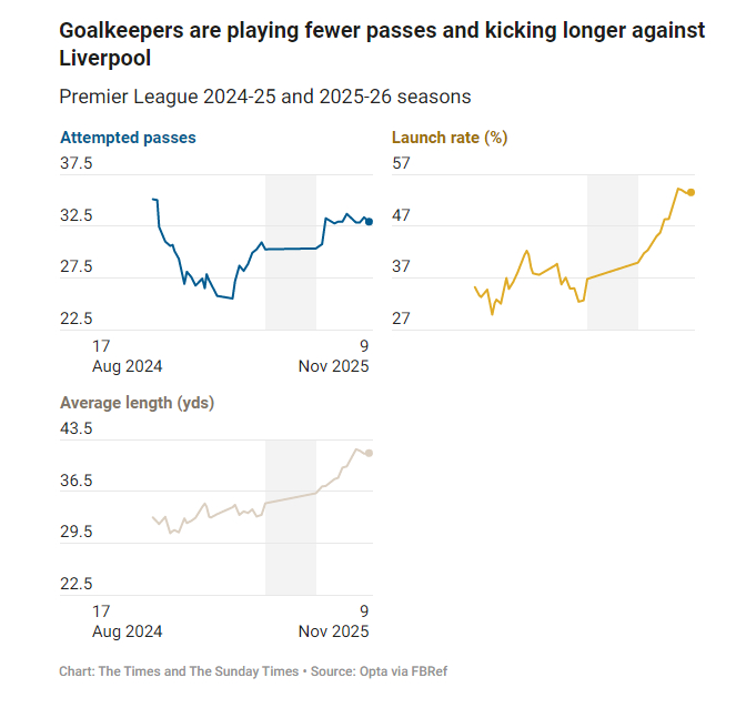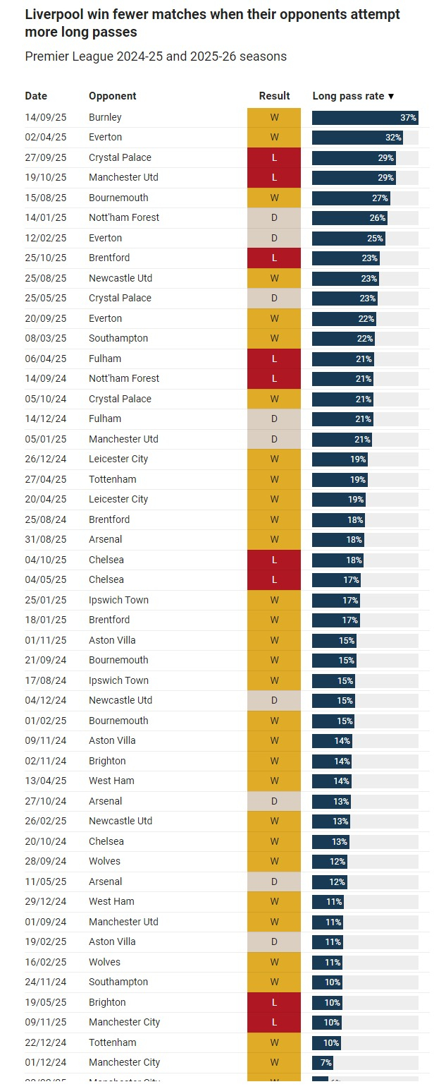 泰晤士报:埃弗顿如何为击败斯洛特的利物浦奠定战术蓝图👀古迪逊公园最后一场默西塞德德比战硝烟散尽,赛中四张红牌与漫天蓝烟的混乱背后,这座球场为埃弗顿留下了最后的馈赠——一套足以克制死敌的战术蓝图。在这场比赛中,詹姆斯·塔尔科夫斯基第98分钟的绝平球让比分定格为2-2。在此之前,斯洛特麾下的利物浦堪称沉着冷静、高效致命的取胜机器。他们曾以7分优势领跑积分榜,唯一的瑕疵是主场不敌诺丁汉森林。但大卫·莫耶斯找到了一套真正能打乱利物浦节奏的战术,他的比赛计划让斯洛特在英格兰执教以来,首次显露了镇定外表下的裂痕。这位埃弗顿主帅采用直传与长传战术,将比赛转化为一场拼抢对决,通过定位球和犯规打破利物浦的节奏。他们的纵向进攻拉扯了客队防线,创造出防线与中场之间的空当并加以利用——中场球员借助前锋贝托的头球摆渡和回做展开进攻。英超联赛不乏视频分析师(这或许是斯洛特不回避谈论球队弱点的原因),利物浦的对手们很快注意到这套战术并纷纷效仿:联赛杯决赛中,纽卡斯尔采用类似战术以2-1获胜;水晶宫上赛季末借鉴了该战术,本赛季沿用(三次对阵利物浦均取胜);伯恩利、埃弗顿和曼联也纷纷跟进。长传战术兴起的背景利物浦在长传面前的脆弱,恰逢联赛中多支球队转向更直接的打法。更多球队选择长传的原因之一,是许多英超球队的逼抢能力已臻化境。上赛季,门将失误次数增多,只因他们面临的逼抢压力持续加大。选择长传可以降低后场组织进攻时被断球的风险。此外,由于多数球队采用人盯人逼抢,前锋与后卫之间常出现一对一局面,持球方只需一脚精准长传就能抓住机会。但利物浦的对手们针对他们使用长传的频率,达到了异乎寻常的程度。不仅场上球员频繁长传,门将也不例外。数据显示,本赛季对阵利物浦时,门将的传球总数较上赛季有所下降,但长传比例更高,传球距离也更远。上赛季,利物浦是英超中高位逼抢最有效的球队之一,能将逼抢获得的球权转化为射门和进球。然而,对手通过长传战术,剥夺了他们逼抢的机会。上赛季利物浦场均逼抢177次,本赛季降至141次,减少了36次(降幅20.4%)。这与对手场均开放比赛传球次数减少47次(降幅11.9%)的数据相吻合。通过长传,利物浦的对手完全避开了他们的后场组织阶段,也就避开了利物浦的逼抢——对手场均短传减少35次,普通长传减少27次,但远距离长传增加15次。这套战术效果显著,也因此对客场球队极具吸引力。上周阿斯顿维拉客场挑战安菲尔德时,乌奈·埃梅里并未选择长传战术。相反,他们试图引诱利物浦前压,再通过地面渗透或过顶球突破防线。但门将埃米利亚诺·马丁内斯在压力下出现失误,让利物浦取得领先——这恰恰印证了为何极少有球队愿意给利物浦逼抢的机会。长传战术的运作逻辑♻这一长传现象的迷人之处,在于利物浦的对手们如何利用它。本赛季利物浦场均争夺的空中对抗增加了11次,较上赛季提升35.5%。然而,利物浦的空中对抗胜率高达56.3%,位列联赛第二。主力中后卫范戴克和科纳特都是空中对抗的高手,职业生涯胜率分别达到75.6%和71.8%。既然利物浦球员通常能赢得长传后的第一落点,为何这仍成为问题?本赛季两人的空中胜率依然居高不下(范戴克78.7%、科纳特70.9%),但利物浦的症结在于,首次对抗之后队友与对手的后续动作。曼联在安菲尔德以2-1击败利物浦的比赛中,将布鲁诺·费尔南德斯、布莱恩·姆贝乌莫、梅森·芒特和马修斯·库尼亚等中场球员部署在利物浦的防线与中场之间。他们抢下第二落点后立即发起进攻,此时利物浦防线尚未站稳,中场和前锋还处于球的前方——球队的首粒进球就是这一战术的完美体现。但利物浦自身也在促成这种“篮球式”来回拉锯的比赛:本赛季他们的“推进速度”(球向对方球门移动的平均速度)位列联赛第三。例如在古迪逊公园对阵埃弗顿时,利物浦也频繁长传——这是因为埃弗顿通过阻断范戴克给赫拉芬贝赫的传球,遏制了利物浦的后场组织:贝托和杜库雷在詹姆斯·加纳和伊德里萨·盖耶的支援下,切断了利物浦的传球路线。周日曼城3-0获胜的比赛中也采用了类似战术:他们允许科纳特控球,但切断其所有传球选择,迫使他只能长传。当球队对利物浦采用人盯人逼抢时,长传是合理选择——上赛季欧冠16强首回合对阵巴黎圣日耳曼时,利物浦就曾尝试过这一战术。路易斯·恩里克的球队高位逼抢,让萨拉赫、卢乔和若塔等球员获得与巴黎后卫一对一的机会。利物浦试图通过直传找到他们,希望创造单刀,但要么第一落点被断,要么第二落点失守,导致无法长时间控球。比赛的来回拉锯态势,意味着他们难以形成持续的控球进攻 —— 无法迫使对手收缩防线,也难以通过即兴配合与战术演练过的轮换跑动撕开对手防线,让萨拉赫和维尔茨等球员充分参与进攻。比赛始终处于攻防转换的快节奏中,利物浦的防线被持续拉扯。频繁陷入落后局面也加剧了这一问题。这反过来又促使对手选择收缩防守,摆出低位防线。本赛季面对低位防守的时间,只有阿森纳比利物浦更长。虽然对手仅21.5%的时间采用高位逼抢,听起来似乎是好事,但利物浦更倾向于面对那些会留下身后空当的对手——这样萨拉赫可以高速插上,格拉文伯奇也能带球突破。尽管周末不敌曼城,但赛季初困扰利物浦的问题——