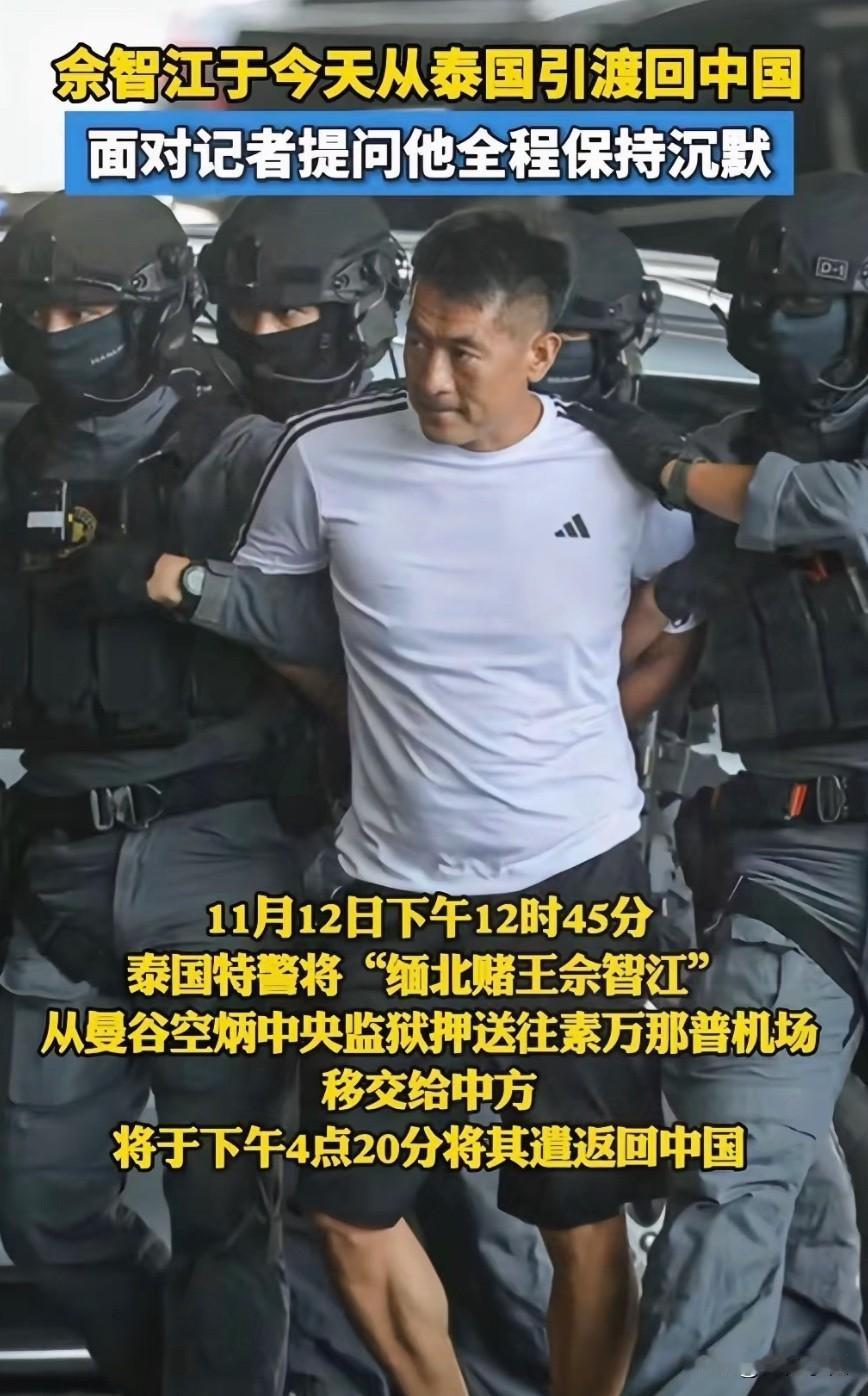 该来的还是逃不掉! 11月12号,佘智江从泰国被引渡回国了。面对记者的提问,他从头至尾都没说话。 这人1982年生在湖南邵阳,后来拿了柬埔寨的国籍,是个跨国犯罪集团的头目之一。 佘智江以前在长沙的洗浴中心上过班,这段经历看着挺普通的,谁也没想到他后来会走上跨国犯罪的路子。 说不定那时候的工作环境和经历,悄悄给后来的犯罪埋下了伏笔。 被警方带回国的时候,他一直保持沉默,不知道是心里藏着事儿不敢说,还是有别的没说出来的情况。 这个跨国犯罪集团背后,估计还有不少没被曝光的隐情等着被揭开。 有网友说,他可能是某个人气很高的漂亮女星的表弟。要是这事儿是真的,对那位女星来说,肯定会面临不少舆论压力。 不过在真相没确认之前,这些都只是大家的猜测而已。 这次的事儿之后,说不定还会有新的进展。警方肯定会深入调查,把这个跨国犯罪集团的事情彻底查清楚,给大家一个明确的说法,让正义能真正落实到位。 读者们,你们觉得呢?有不同看法的,可以在评论区一起聊聊。