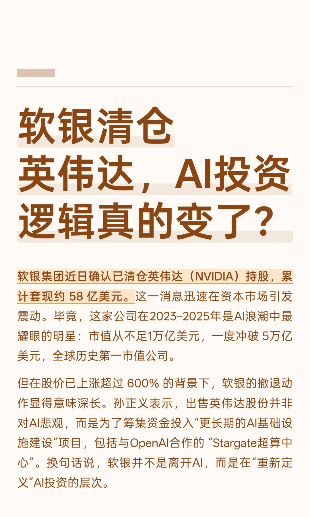 但在股价已上涨超过 600% 的背景下,软银的撤退动作显得意味深长。孙正义表示,出售英伟达股份并非对AI悲观,而是为了筹集资金投入“更长期的AI基础设施建设”项目,包括与OpenAI合作的 “Stargate超算中心”。换句话说,软银并不是离开AI,而是在“重新定义”AI投资的层次。