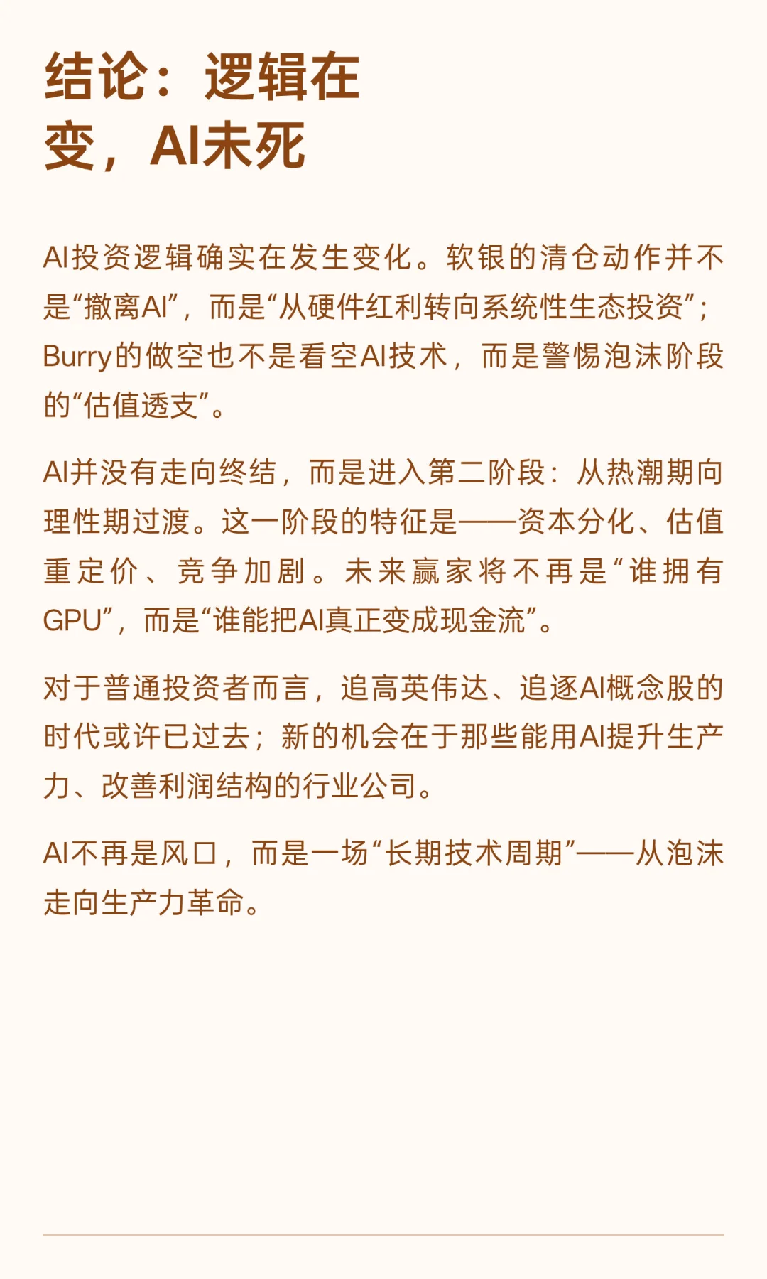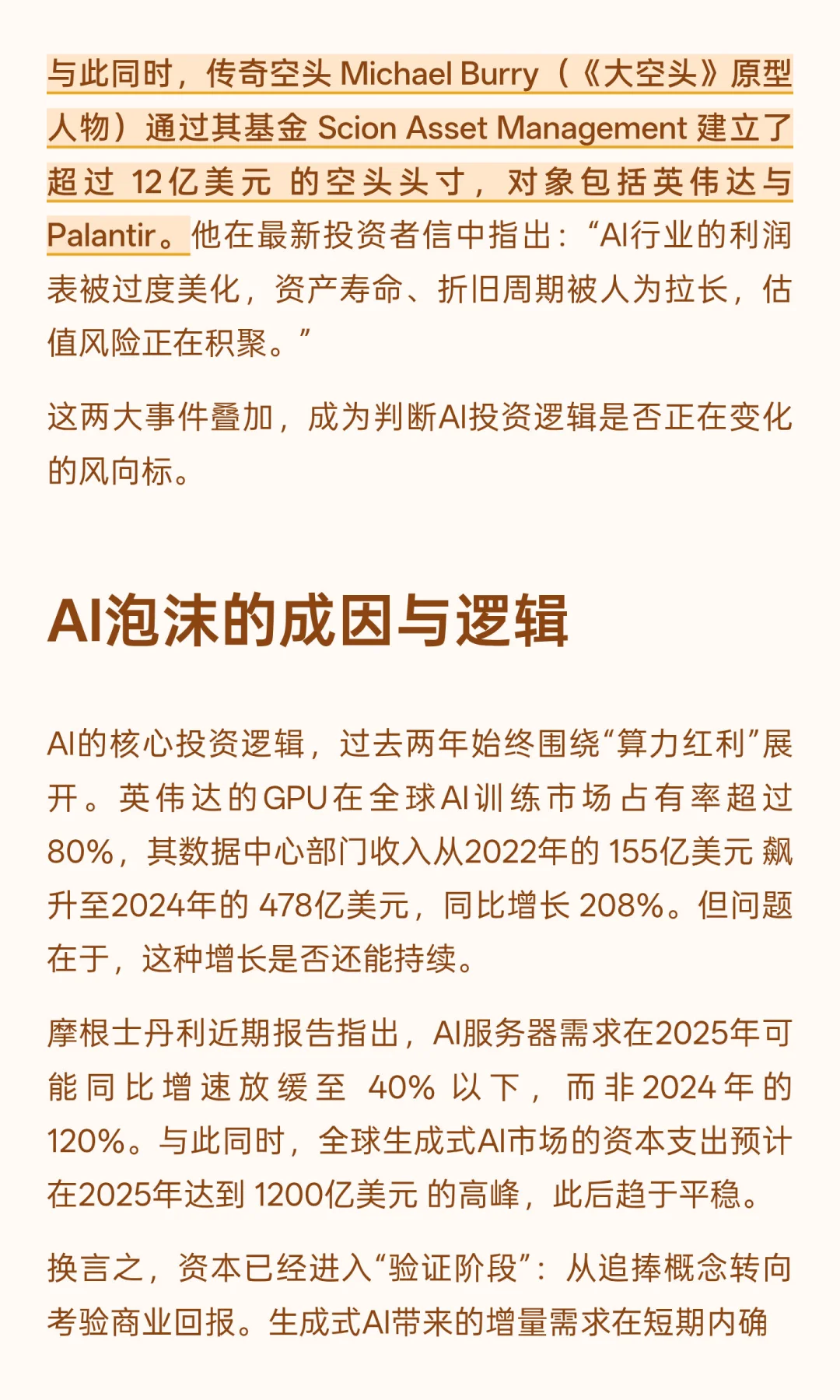 与此同时,传奇空头 Michael Burry(《大空头》原型人物)通过其基金 Scion Asset Management 建立了超过 12亿美元 的空头头寸,对象包括英伟达与Palantir。他在最新投资者信中指出:“AI行业的利润表被过度美化,资产寿命、折旧周期被人为拉长,估值风险正在积聚。”