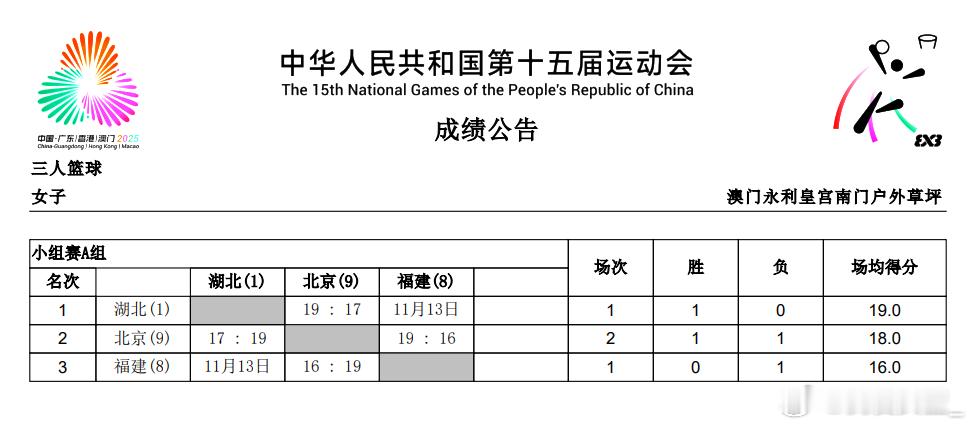 【全运会三人女篮现极端案例:依靠种子排序 湖北队小组头名晋级】十五运三人女篮A组小组赛的三场比赛全部结束,在中午结束的一场比赛中,由陈玉婕、霍俊彤、周梦云和王嘉欣组成的湖北队在一度3-11落后的情况下奋起直追,最终遗憾地17-18负于福建队。如此一来,湖北队、北京队和福建队在小组赛阶段的战绩都是1胜1负,小组排名及出线资格成为焦点问题。 根据三人篮球的规则,积分相同则先比积分相同队伍间的胜负关系,湖北队、北京队和福建队也都是1胜1负;胜负关系相同则再比较总得分,湖北队(19-17、17-18)总得分36分,北京队(17-19、19-16)总得分也为36分,福建队(16-19、18-17)总得分为34分,因此湖北队和北京队以小组前两名的身份晋级1/4决赛。 湖北队和北京队总得分也相同,那怎么分出排名高低呢?根据三人篮球项目的规则,若总得分也相同则比较种子排序,即队伍综合实力反映在积分上的排序。官方成绩公告显示,湖北队为本次比赛的1号种子,北京队为9号种子,因此湖北队小组第一,北京队小组第二。 我爱女篮咨询多位三人篮球领域的专业人士,都表示小组排名要靠种子排序来决定这一点非常罕见,这也侧面反映出种子排序的重要性。