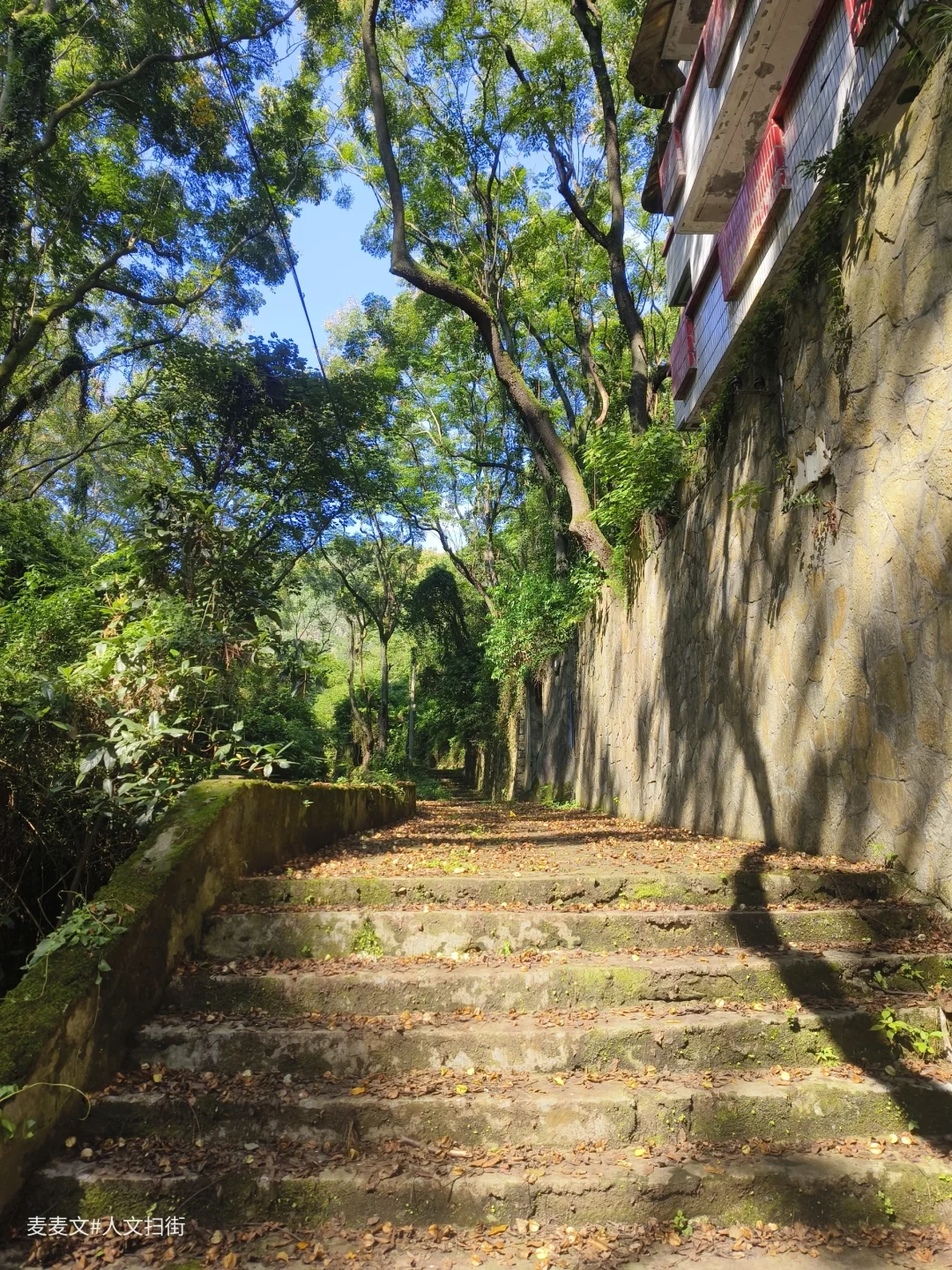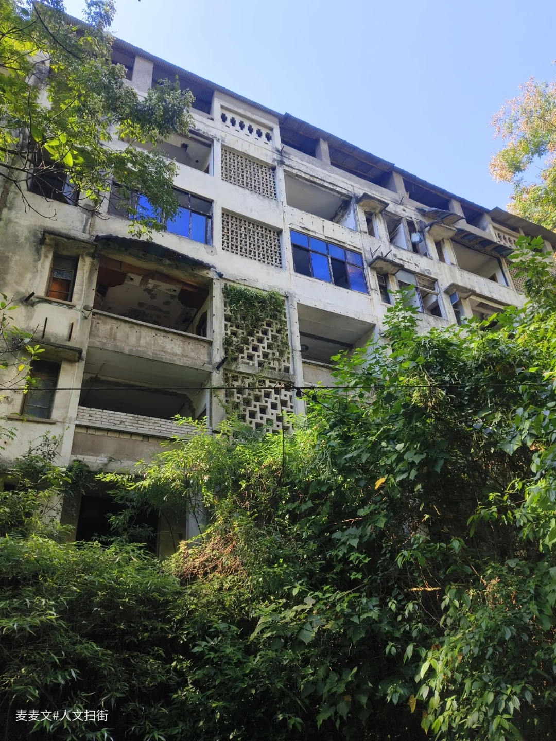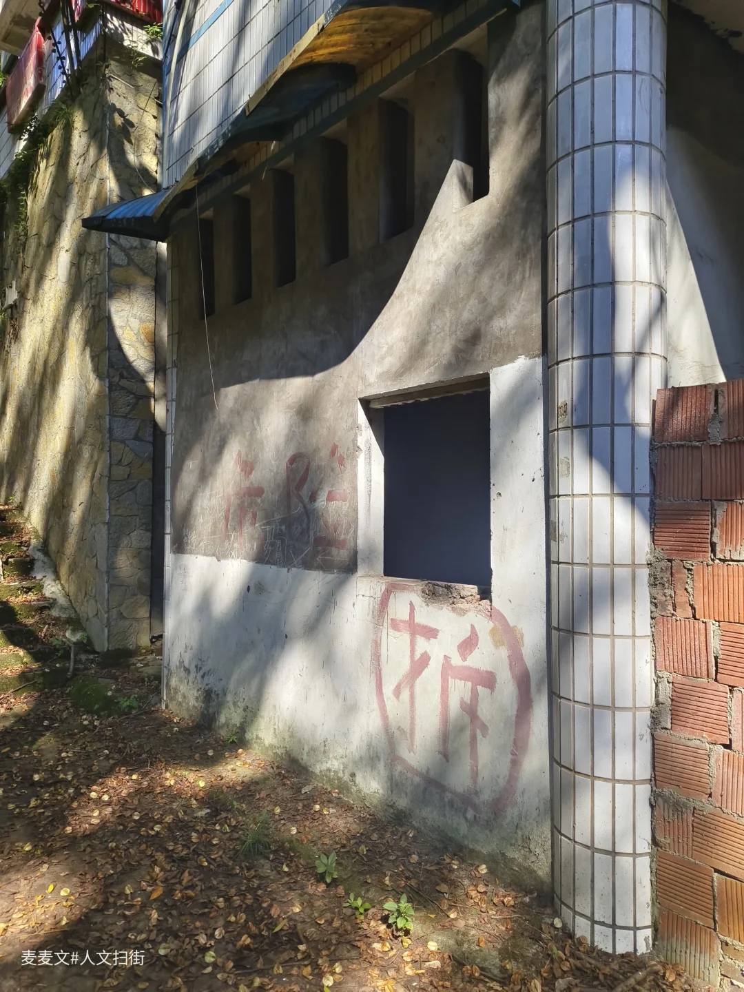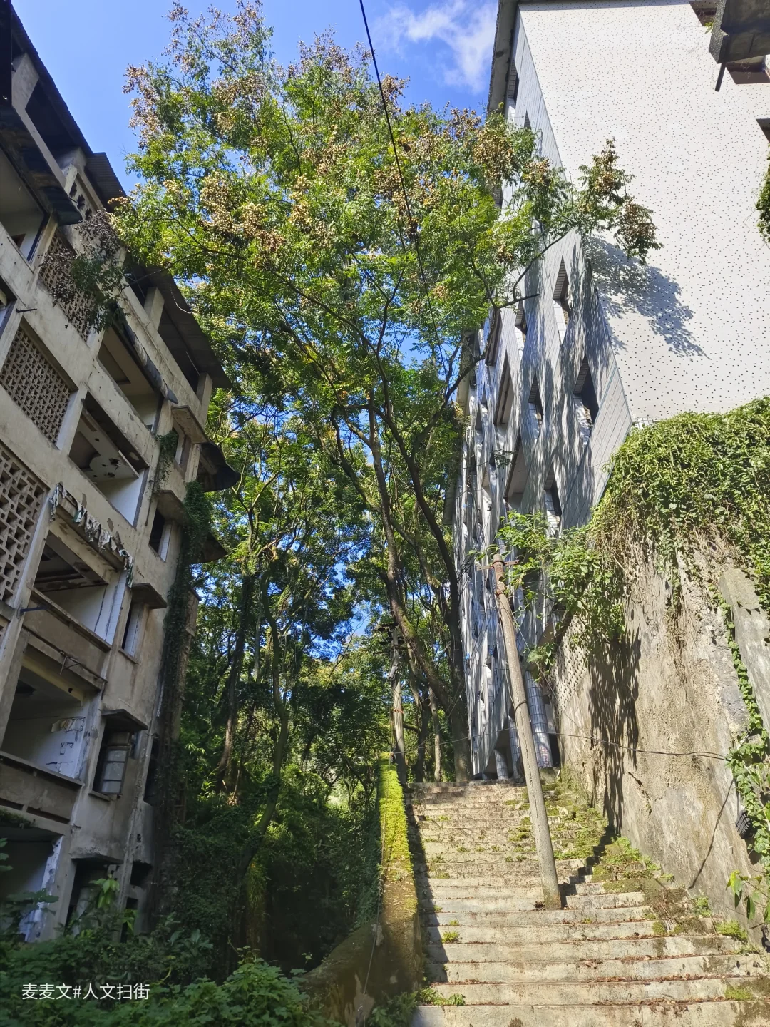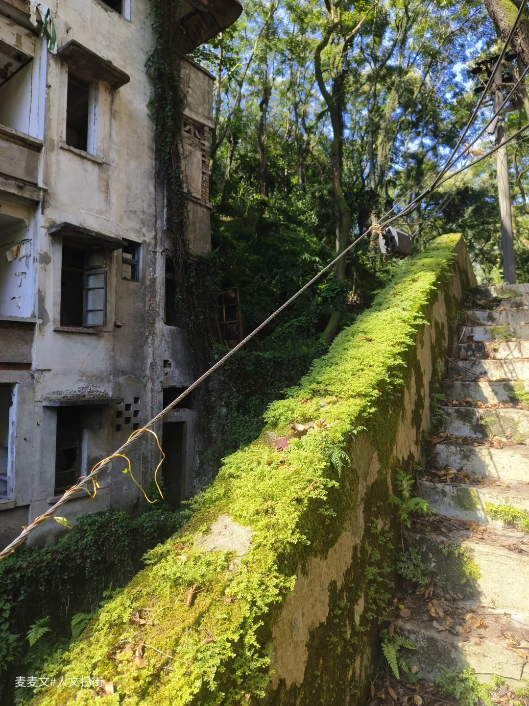 沿着上山的路前行,目之所及,两旁的居民楼已然人去楼空,墙体斑驳,爬满岁月痕迹。可就在这废弃之中,自然力量蓬勃生长。藤蔓缠绕建筑,绿植铺满台阶,阳光透过枝叶洒下,光影交错,宛如绿野仙踪里的奇幻场景,又带着梦核世界的迷幻与疏离。
