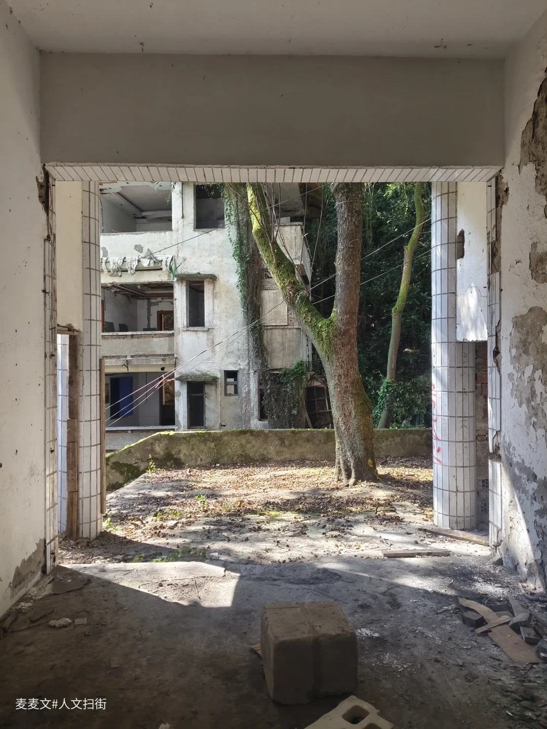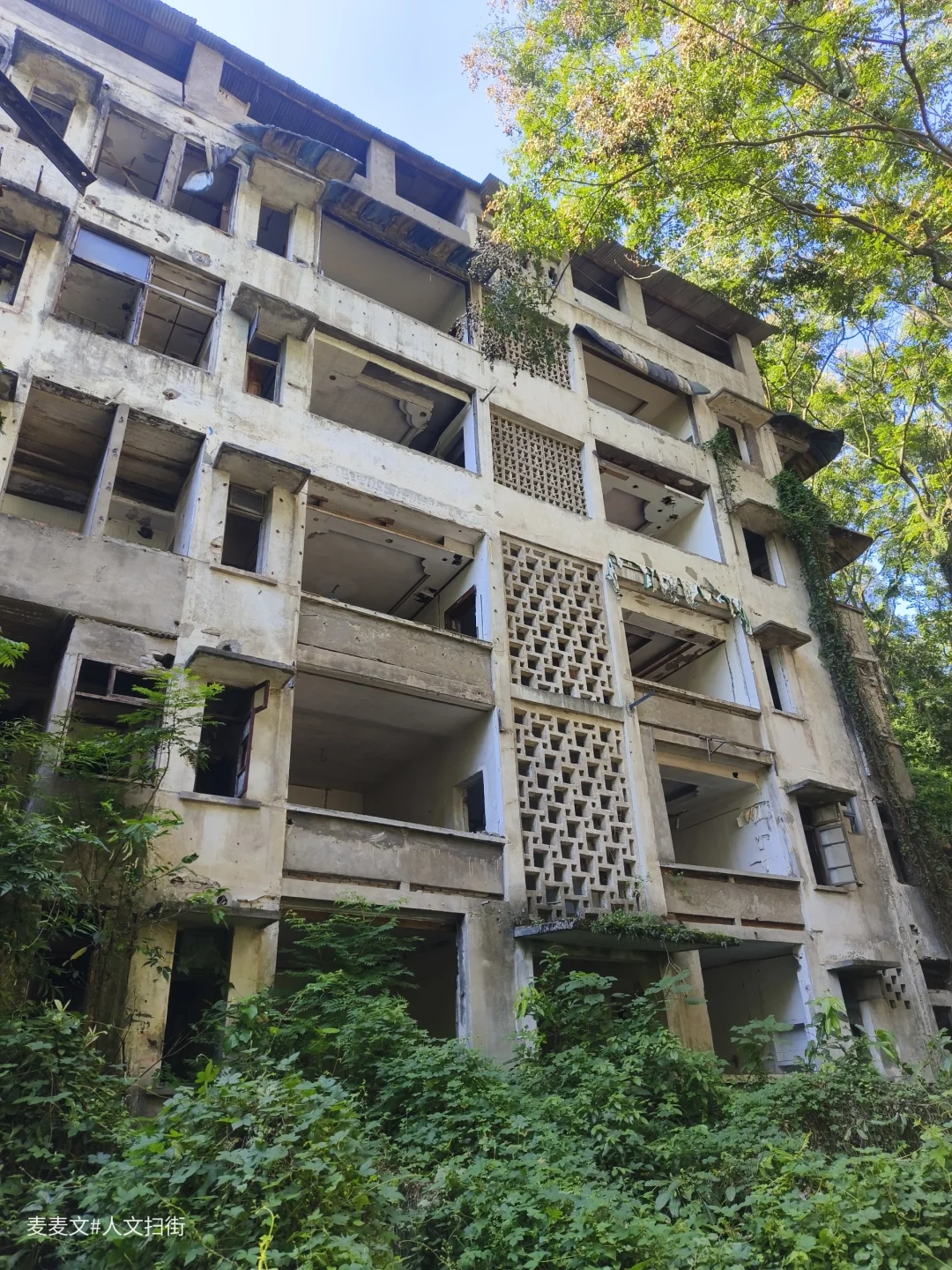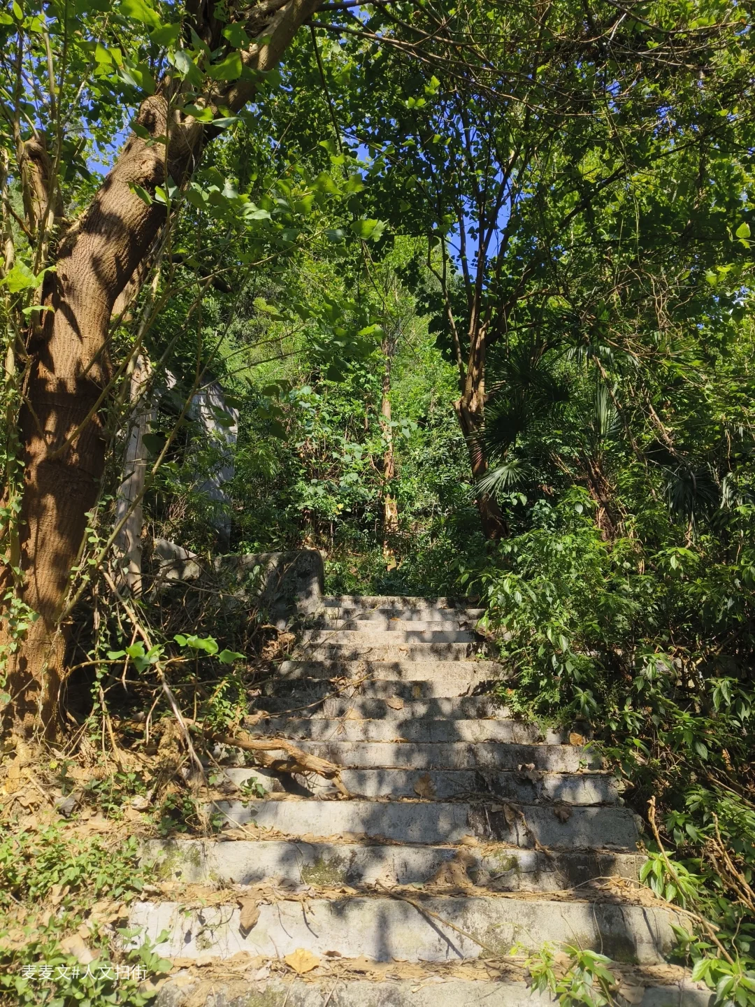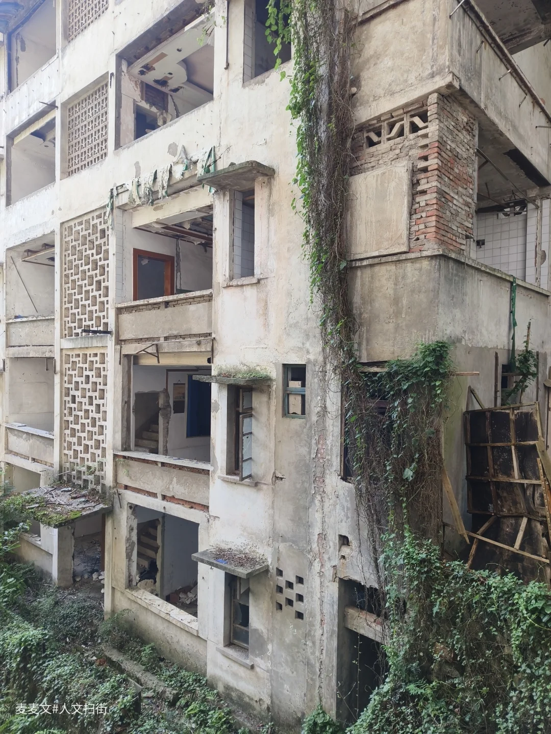 沿着上山的路前行,目之所及,两旁的居民楼已然人去楼空,墙体斑驳,爬满岁月痕迹。可就在这废弃之中,自然力量蓬勃生长。藤蔓缠绕建筑,绿植铺满台阶,阳光透过枝叶洒下,光影交错,宛如绿野仙踪里的奇幻场景,又带着梦核世界的迷幻与疏离。