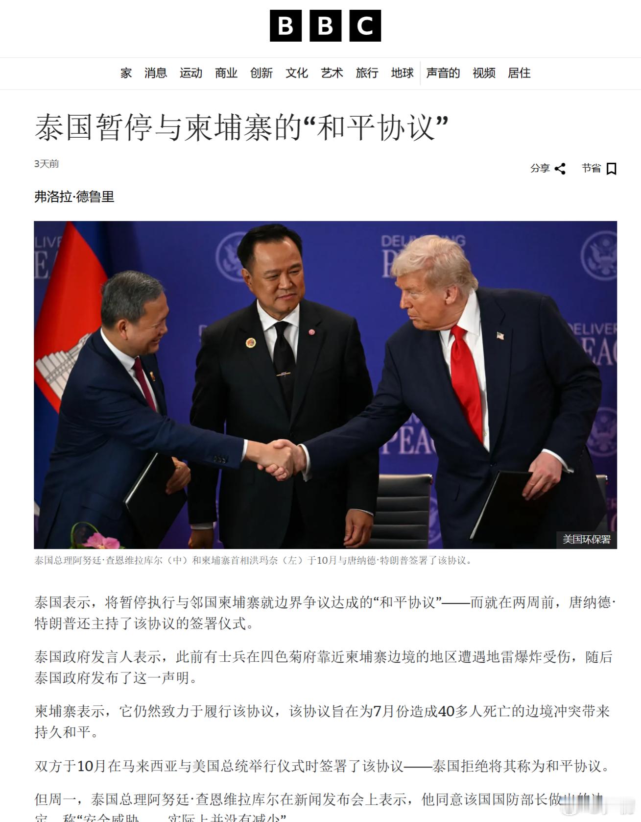 BBC:泰国表示,将暂停执行与邻国柬埔寨就边界争议达成的“和平协议”—而就在两周前,美国总统特朗普还主持了该协议的签署仪式。签的时候是多么的“从从容容、游刃有余”.....